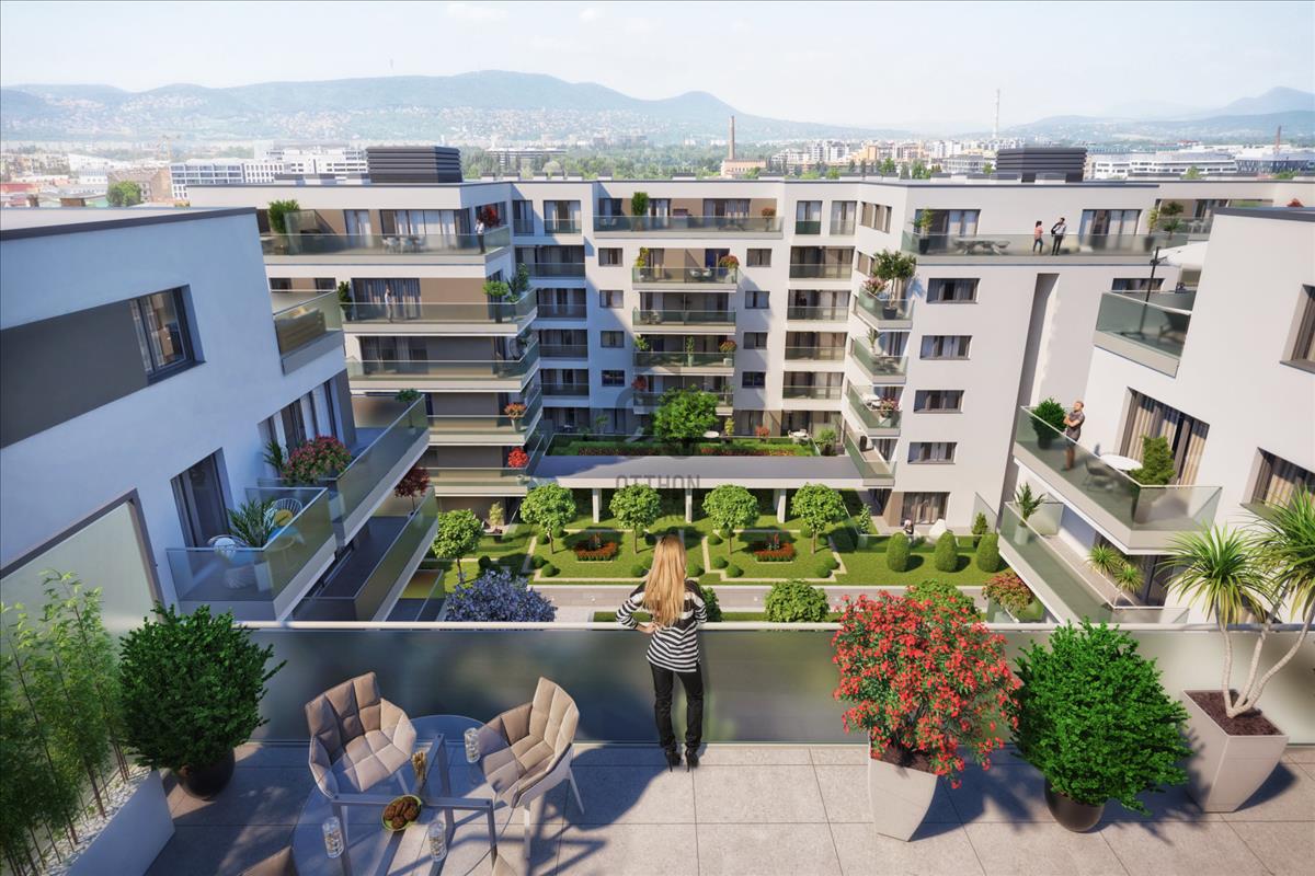 A 6. emeleti penthouse lakásokból pazar kilátás nyílik a budai hegyekre, a kényelmet pedig biztosítja, hogy a nagy teraszon jacuzzi-nak kialakítható hely is található.