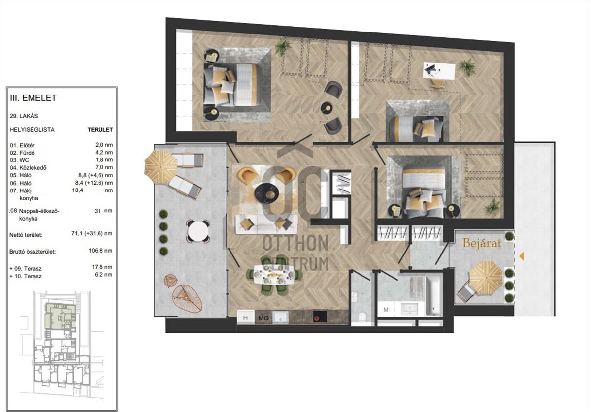 - 4 szobás (amerikai konyhás nappali, közel 32 nettó nm + 3 háló)