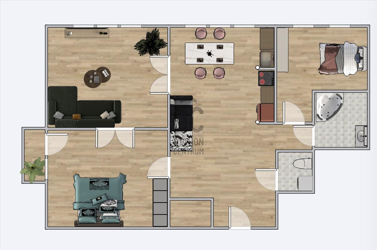 A lakás tágas terekkel rendelkezik. Tulajdoni lapon 3 szobás, de a 25 nm -es étkező konyhát amerikai konyhás nappaliként is használhatjuk, így 3 külön bejáratú háloszobánk lehet.