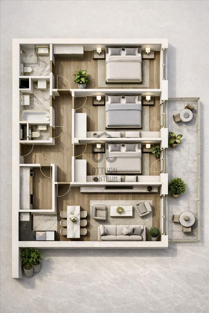 - 4 külön nyíló szoba (nappali + 3 hálószoba)