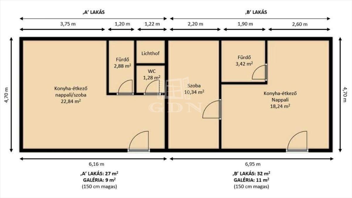 •„B” lakás: 32 m² + 11 m² galéria, teljes berendezéssel és gépesítéssel, azonnal hasznosítható formában.