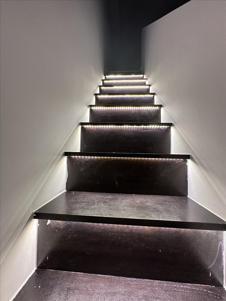 - galériára vezető lépcső fából, megvilágított lépcsővel