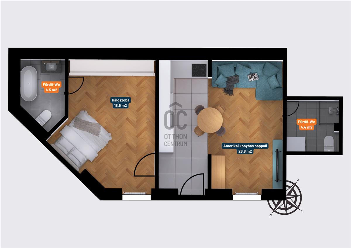 ✅ Felosztása: amerikai konyhás nappali és étkező, hálószoba, kádas fördőszoba-wc, zuhanyzós fürdőszoba-wc.