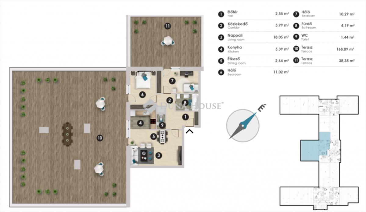 Az ingatlan nappali+2 hálós, a nappaliból, és a hálókból is kiléphetünk a teraszokra.