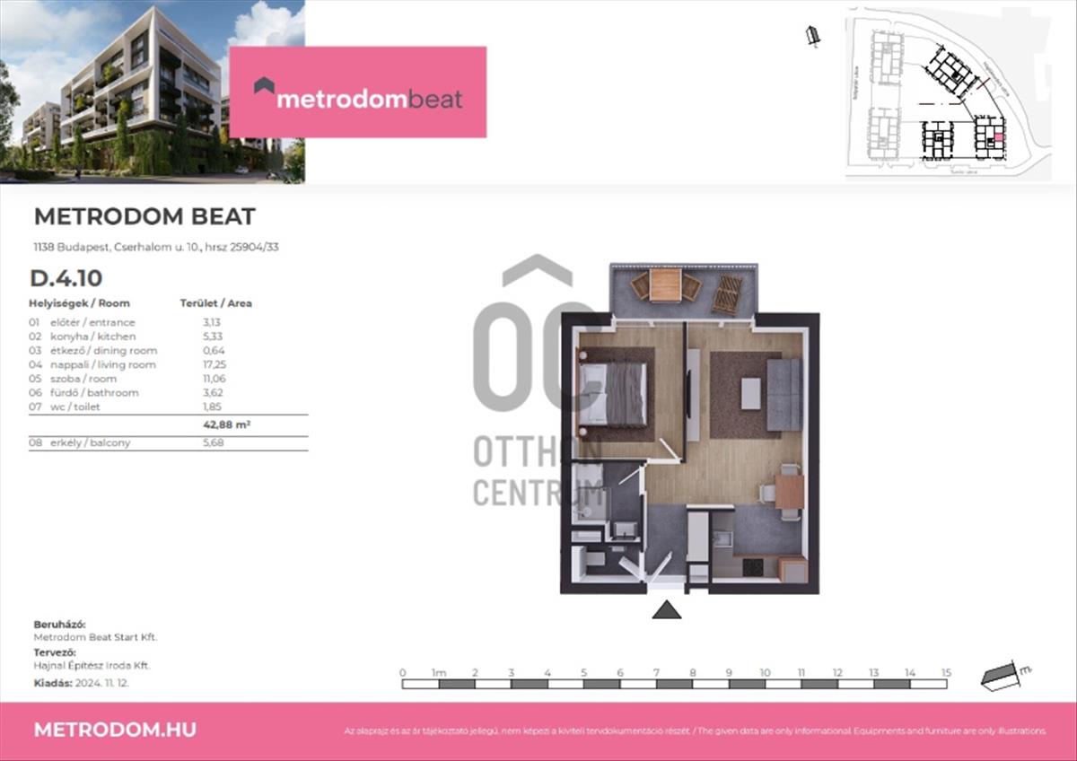 42, 70 M² nettó alapterületéhez egy 5, 68 m²-es terasz kapcsolódik, míg az eladható hasznos alapterület 45, 54 m² – ideális arány, kényelmes, jól élhető terek.