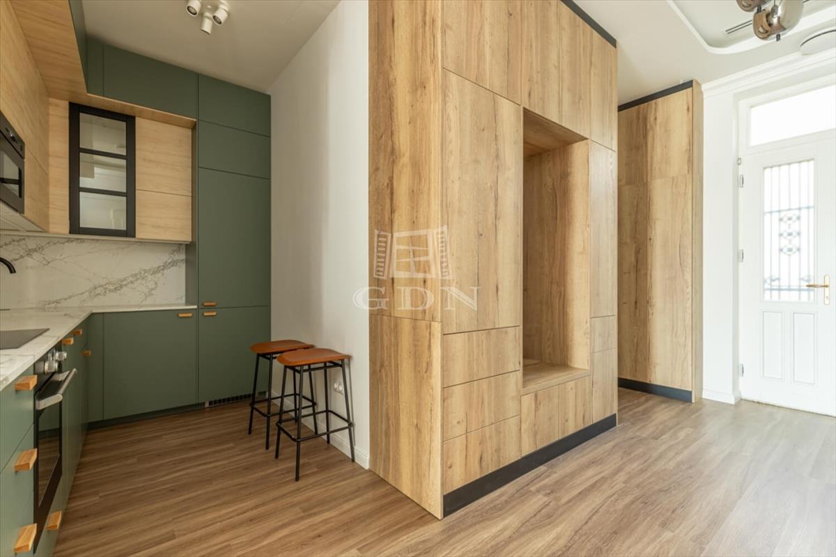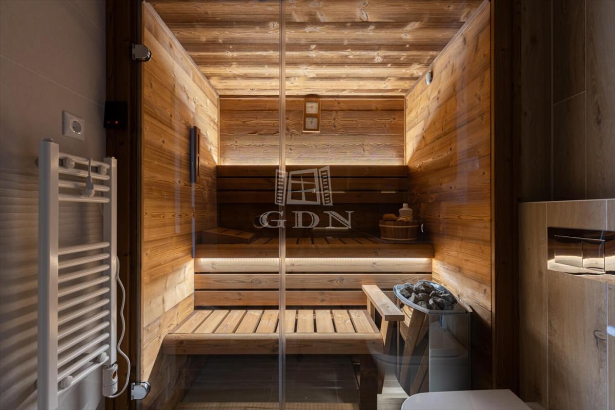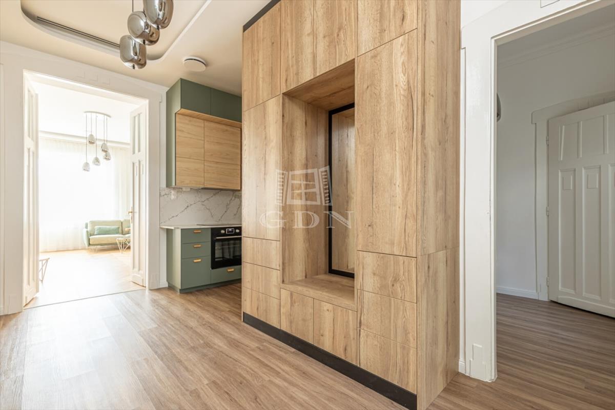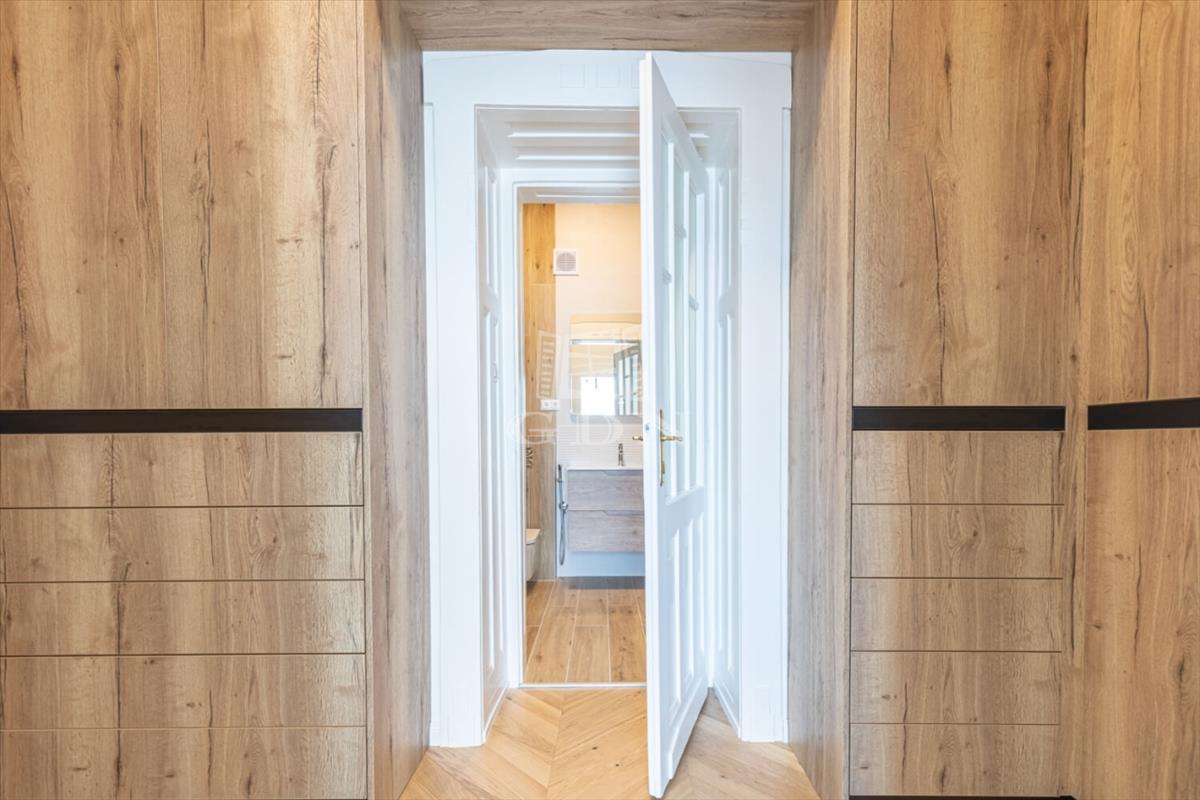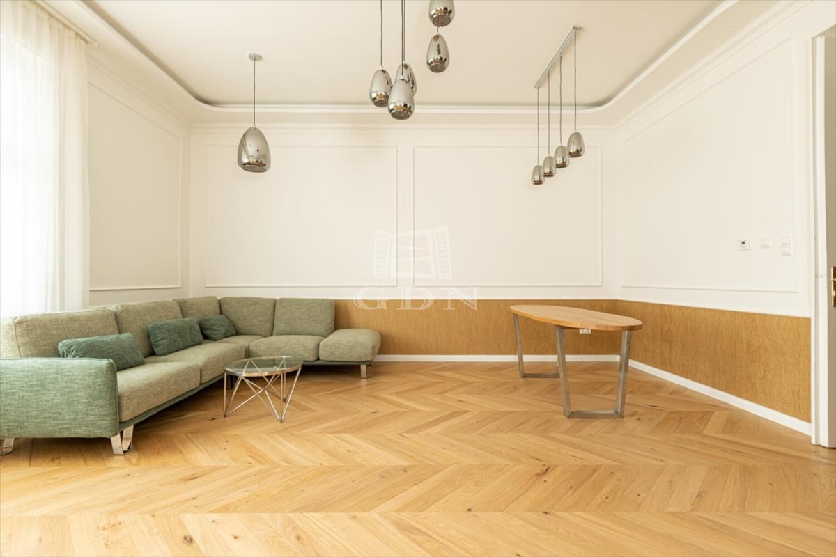 The apartment features two bathrooms: the master has a bathtub and sauna, while the second is equipped with a shower. With 3. 2-Meter ceilings, herringbone oak parquet, and patinated interior doors, the home exudes timeless elegance, complemented by high-quality custom furniture and designer finishes.