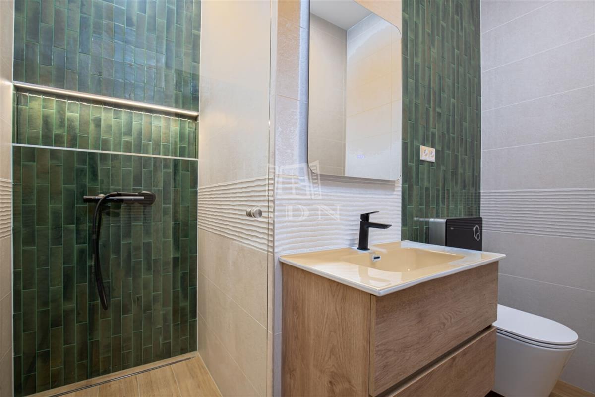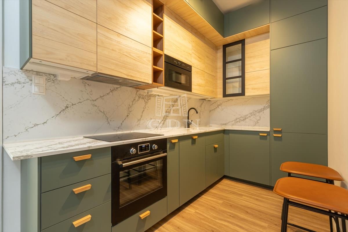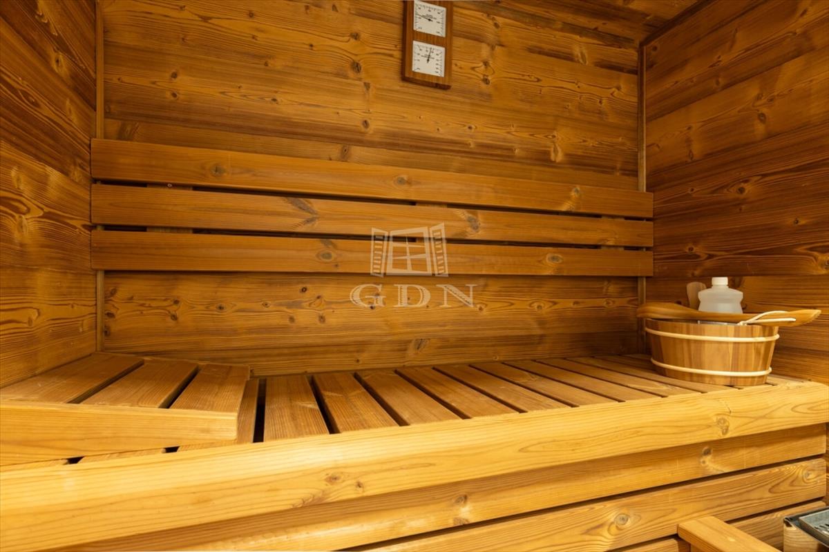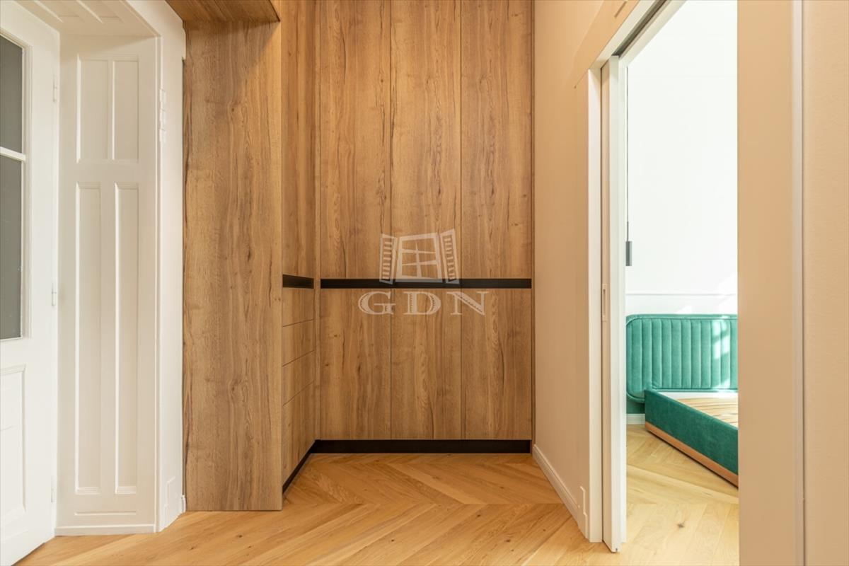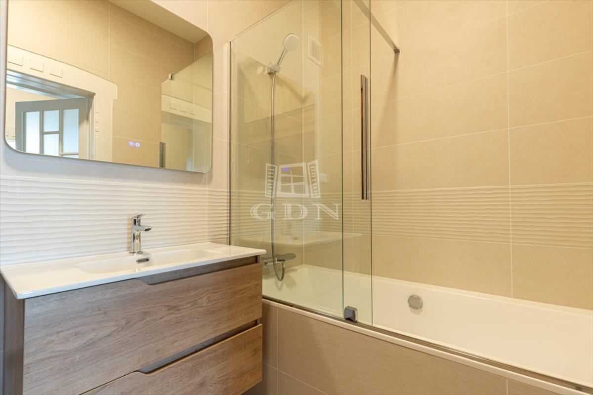 The apartment features two bathrooms: the master has a bathtub and sauna, while the second is equipped with a shower. With 3. 2-Meter ceilings, herringbone oak parquet, and patinated interior doors, the home exudes timeless elegance, complemented by high-quality custom furniture and designer finishes.
