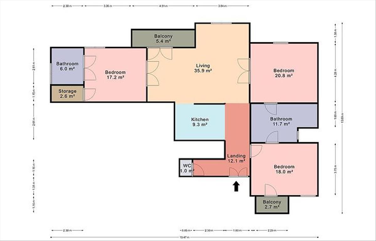 Az ingatlan tágas, jól átgondolt elrendezésű: 4 külön nyíló szoba, 2 fürdőszoba, valamint 2 wc (ebből az egyik külön helyiségben) biztosítja a kényelmet akár nagyobb család számára is. a lakás különlegessége a két erkély, melyek közül a nagyobb az utcára, a kisebb a csendes belső udvarra néz.