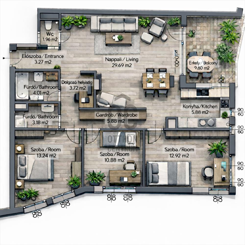 A lakás tágas, barátságos terekből áll: nappali, 2 hálószoba és gardróbszoba, ideális választás kényelmes, otthonos élethez egy hangulatos környéken.