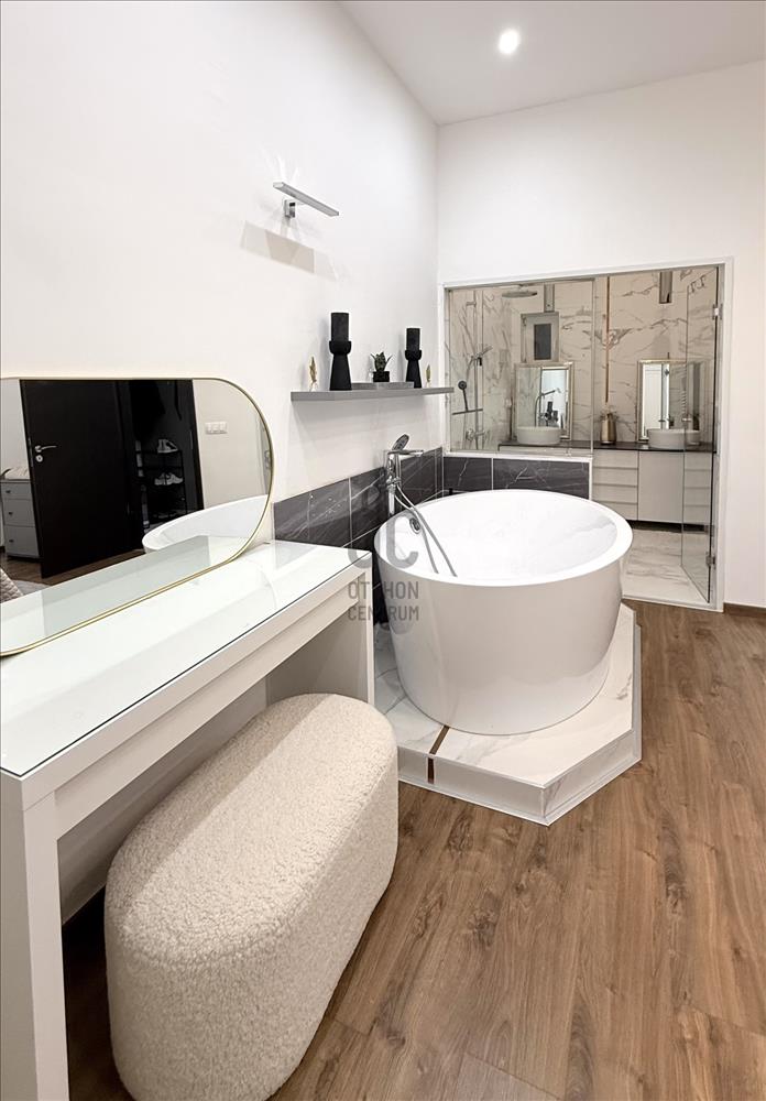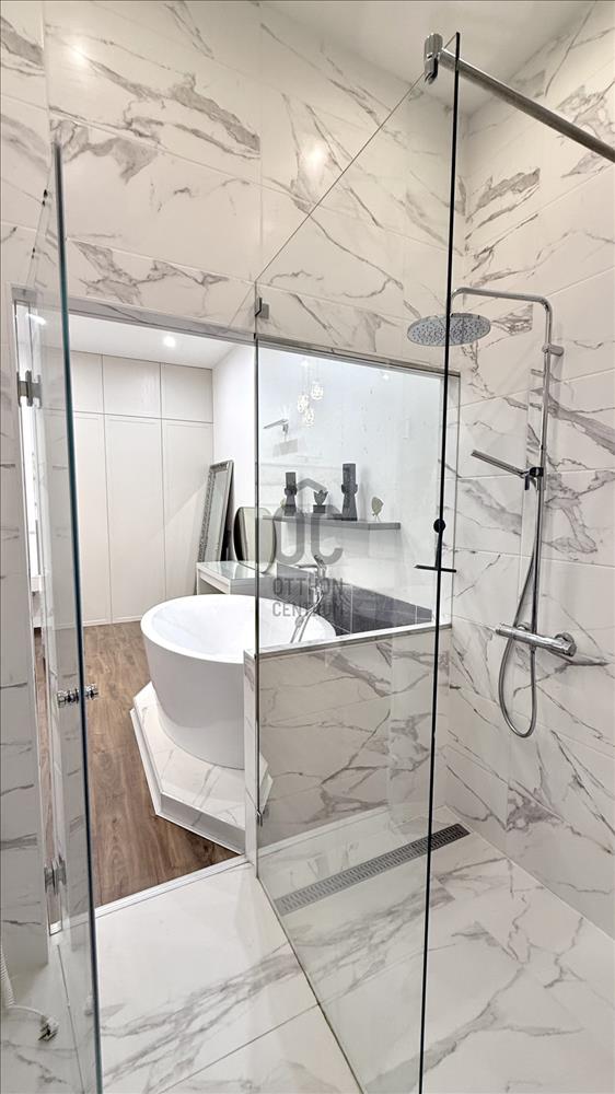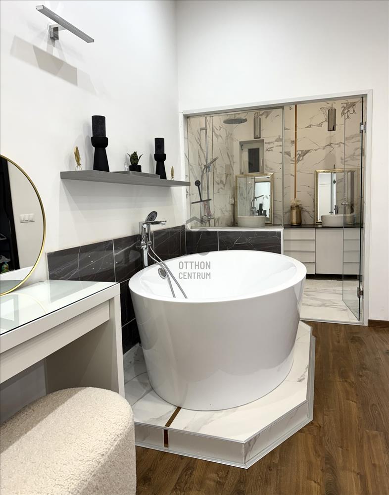 A lakás különlegessége a szabadon álló designkád, a walk-in zuhany.