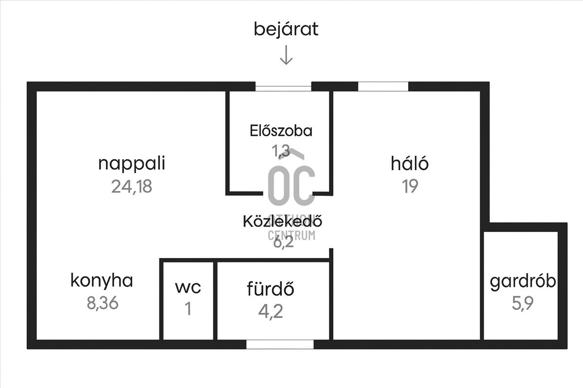 Helyiségek: nappali-konyha-étkező, hálószoba, fürdőszoba, külön wc -kézmosó, gardrób, előszoba