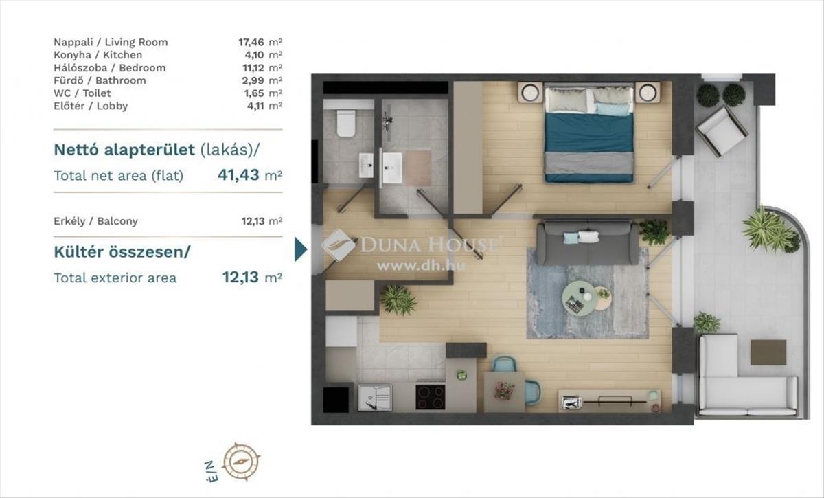 2 szoba, összesen 41, 43 m² lakótér