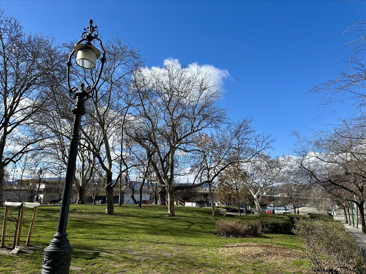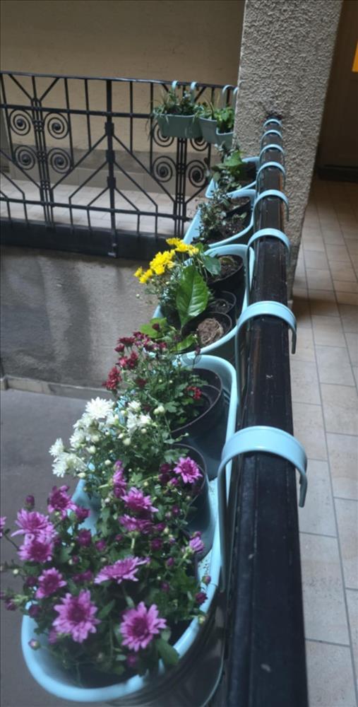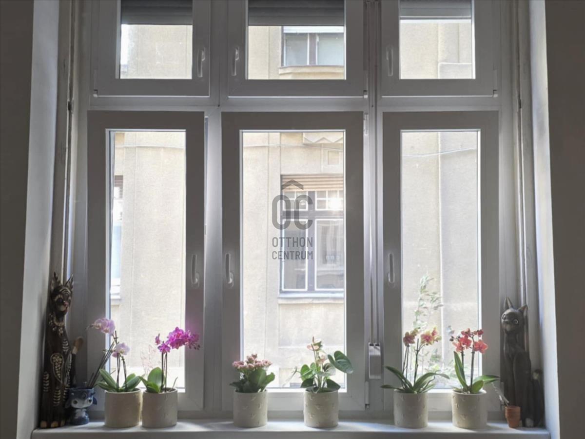 Ablaka egy szintén frissen felújított és gondozott kis növényi parkra is néz, valamint kihajolva még a Duna is látható.