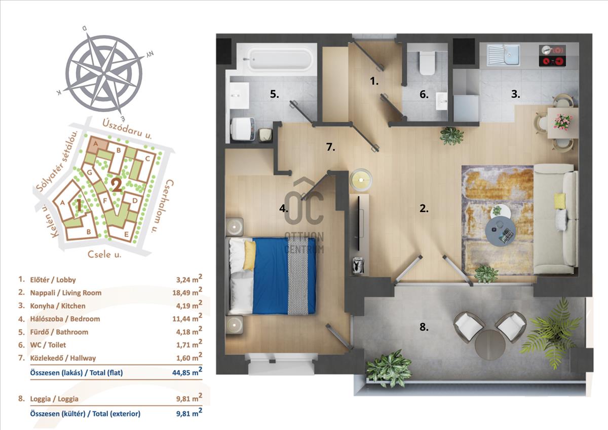 - 1. emeleti, 44, 85 m2-es, 2 szobás, 9, 81 m2-es loggia-val rendelkező ingatlan.