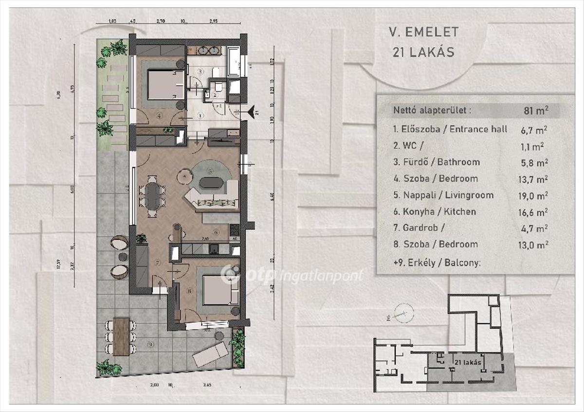 Az ingatlan egyedi ízlés szerint alakítható, szabadon választhatók a szaniterek, hideg/meleg burkolatok, beltéri ajtók.