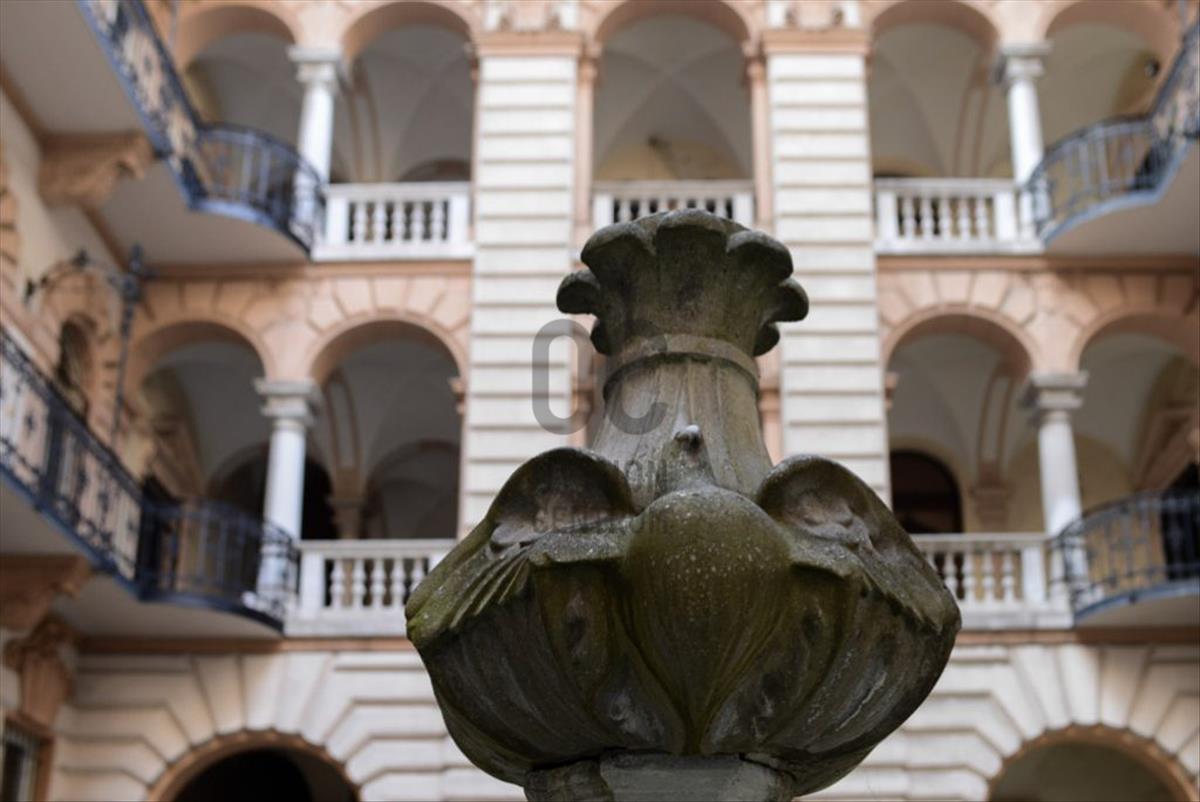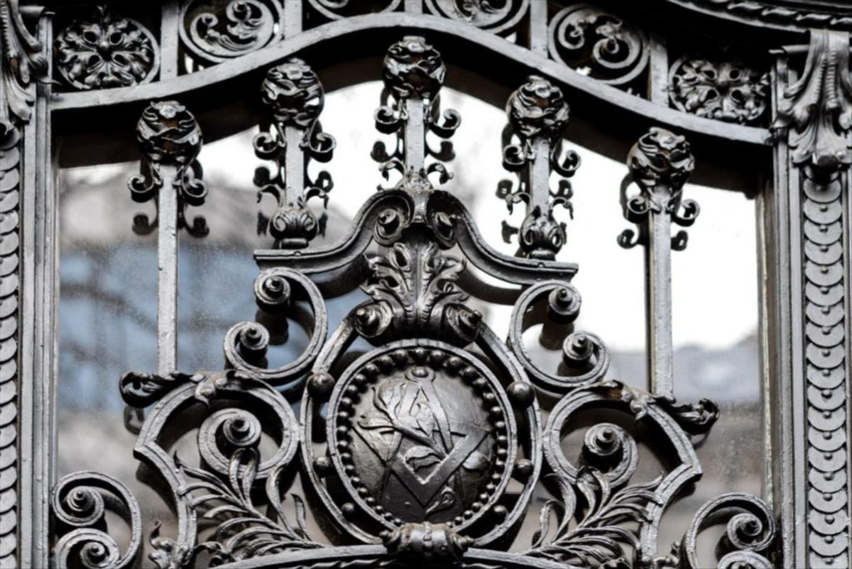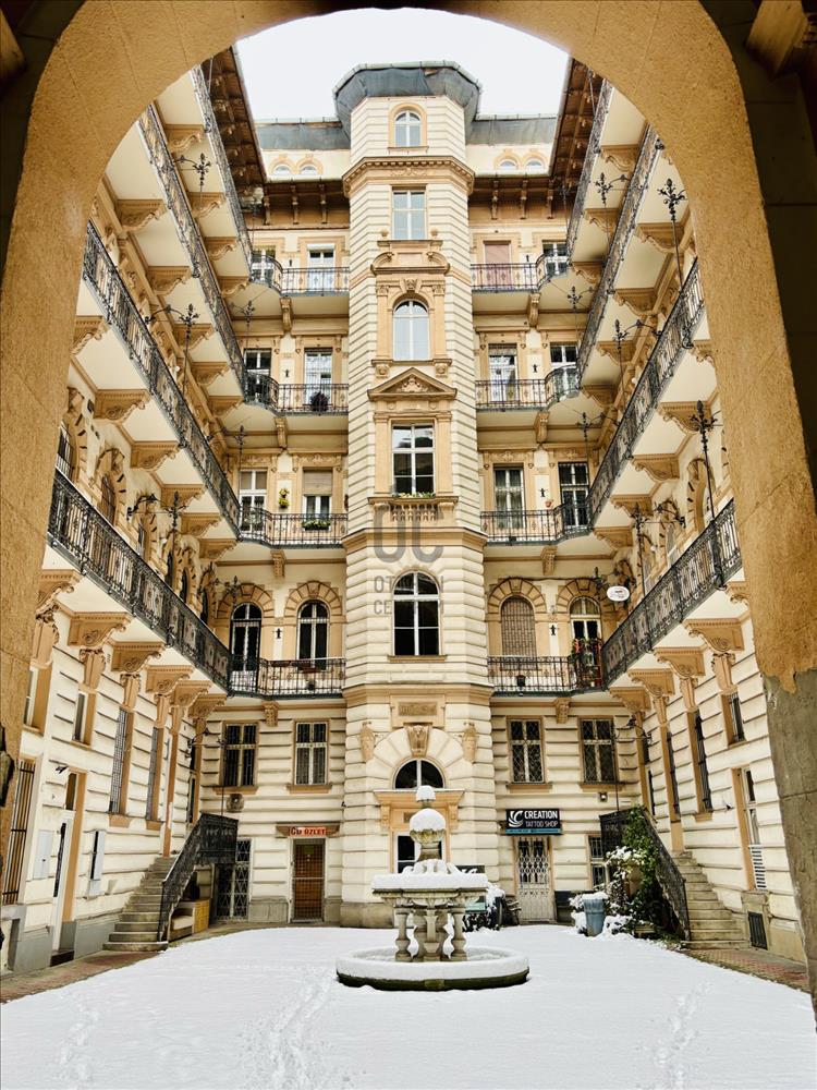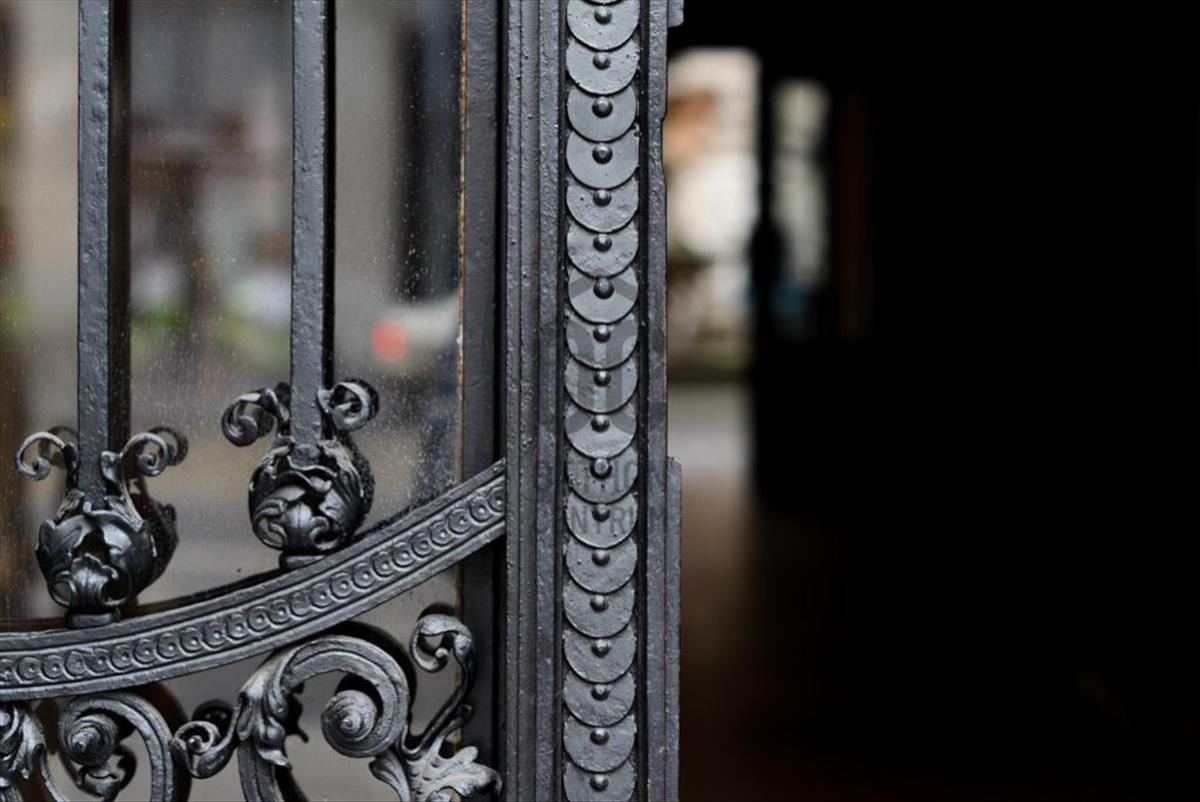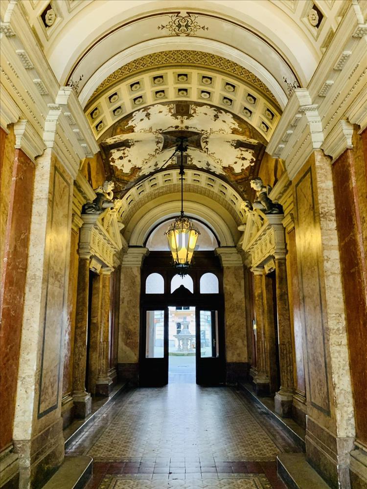 -A négyemeletes épület kétszárnyú, díszes kovácsolt vas kapuján belépve két nagy méretű lámpára és a keresztboltozatos mennyezet díszes festésére leszünk figyelmesek.