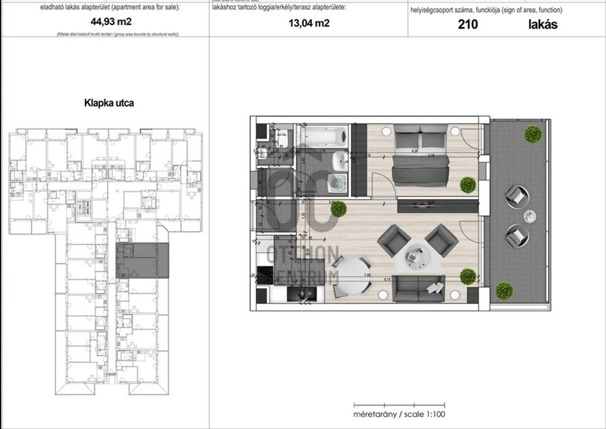 A 45nm-es alapterületen nappali-étkező-konyha, hálószoba, előszoba, külön fürdő és wc került elhelyezésre. 13 Nm-es terasz is tartozik a lakáshoz, amely a csendes belső kertre néz.