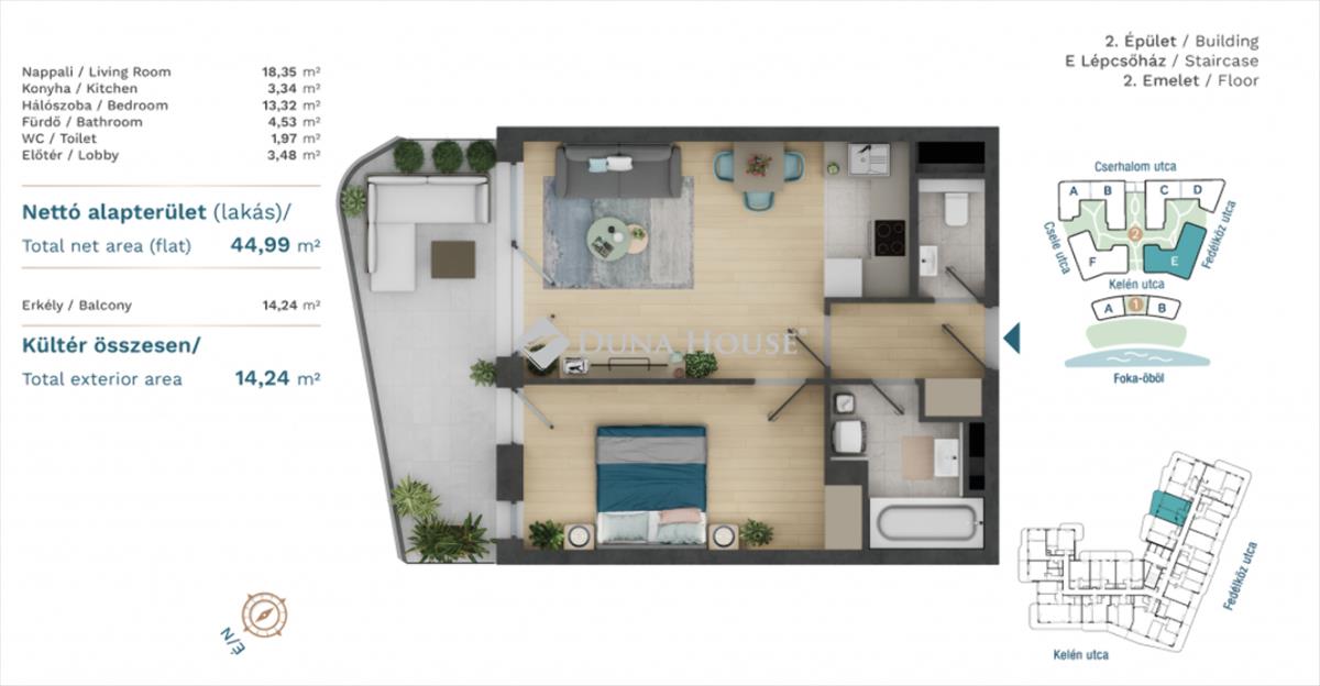Eladó exkluzív 2 szobás belső kertre néző lakás a Marina Parton vízparti társasházban! Fedezze fel a modern városi életstílus és a természet közelségének tökéletes harmóniáját Budapest egyik legkeresettebb részén a Marina Parton! -Lakás jellemzői:Újépítésű, exkluzív társasház 2. emelet2 szoba, összesen 44, 99 m² lakótér+Tágas, 14, , 24 m²-es erkélyÁtadás várható: 2026. Szeptember-Befektetésnek és otthonnak is ideális:Legyen szó hosszú távú befektetésről vagy saját használatról, ez az ingatlan biztos választás. a Marina Part kiemelkedően jó lokációval, magas bérleti hozammal és folyamatos értéknövekedéssel büszkélkedhet. -Fizetési ütemezés elérhető! Ne maradjon le erről a páratlan lehetőségről! Keressen bizalommal.