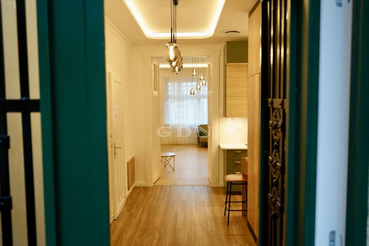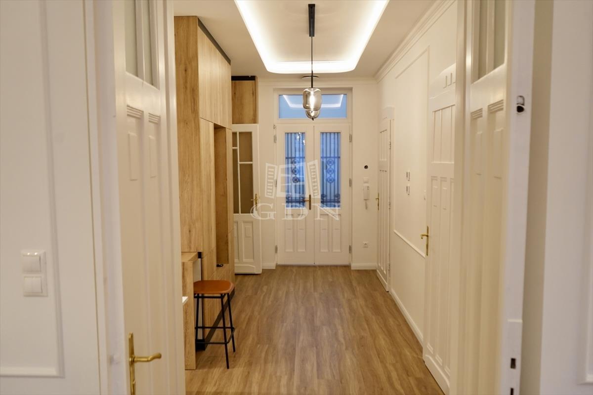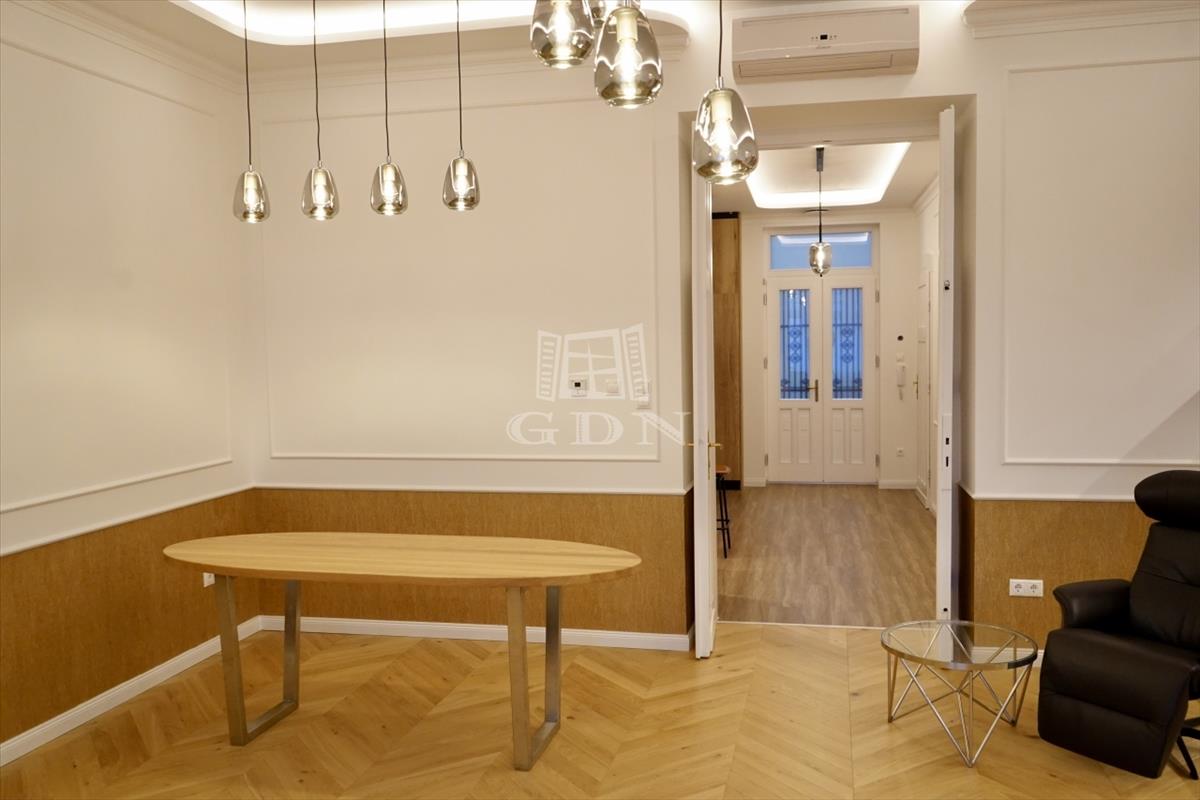 A 3, 2 méteres belmagasság, a klasszikus halszálkamintás tölgyfa parketta és a felújított, patinás beltéri ajtók időtálló nagypolgári hangulatot teremtenek, amely harmonikusan kapcsolódik a modern megoldásokhoz. Az enteriőr kifinomultságát designlámpák és gondosan kiválasztott burkolatok erősítik, egységes és elegáns összképet alkotva.