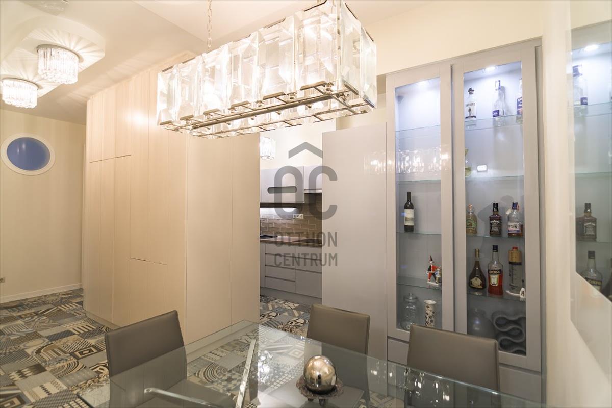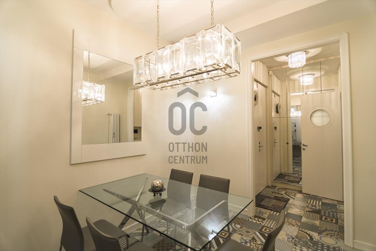 A biztonsági bejárati ajtón belépve az előszobában egy tükrös beépített szekrény fogad. Szemben a zuhanyzós fürdőszoba, jobbra az étkező található. Itt mindenhol egyedi tervek alapján készült elegáns vonalvezetésű bútorok kerültek beépítésre. a közlekedőből nyílik még egy fürdőszoba, majd az impozáns nappaliba léphetünk, amely hatalmas ablakokkal, stílusos álmennyezettel és halszálkában rakott faparkettával fogad.