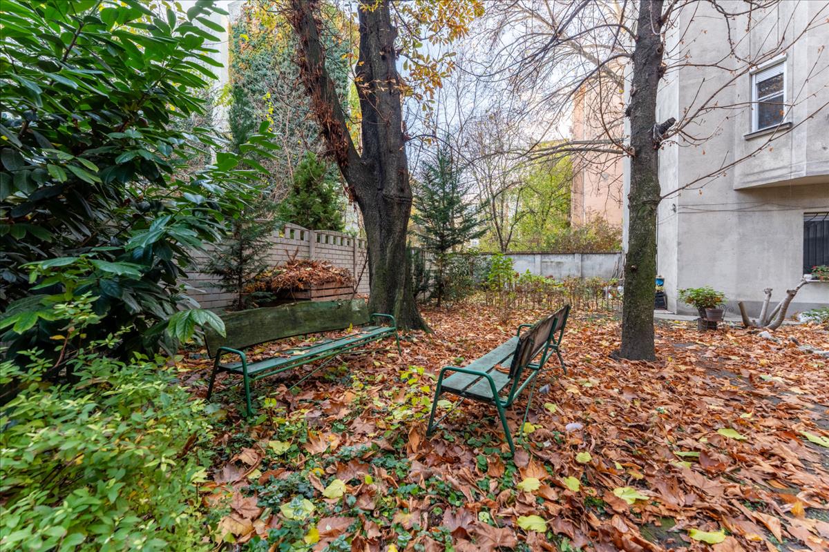 A belső udvar külön érték: zöld, csendes kert, padokkal és fedett biciklitárolóval — ritka előny a környéken.