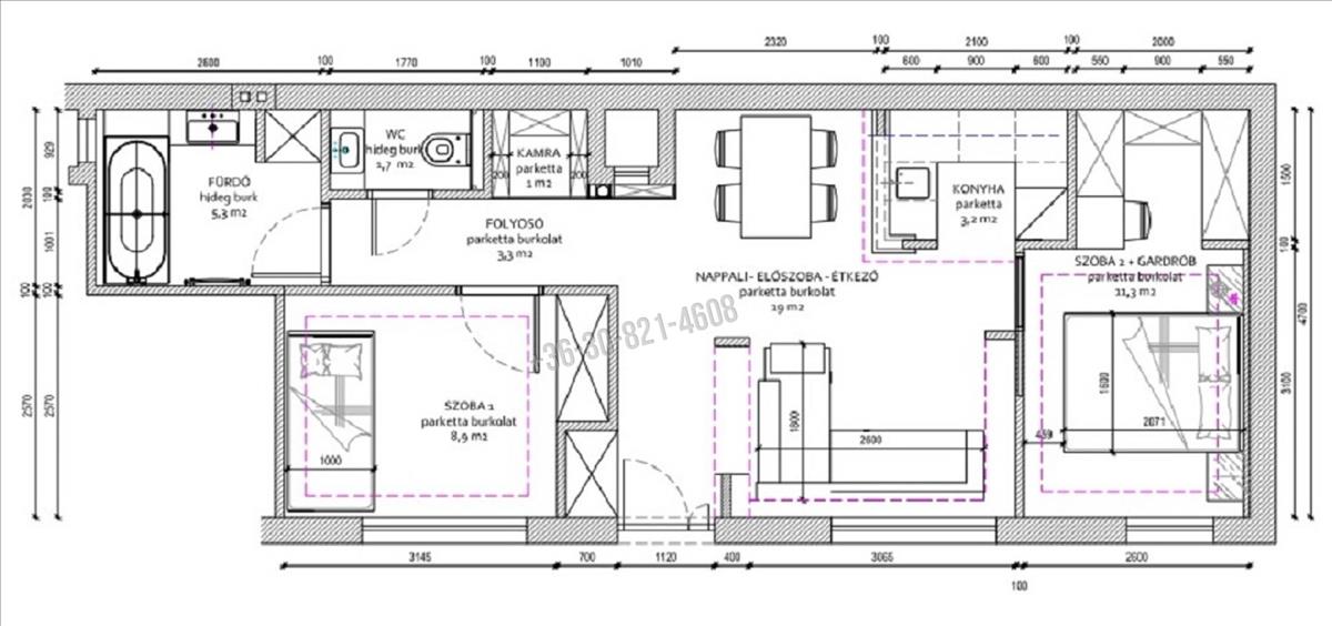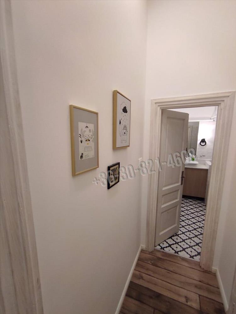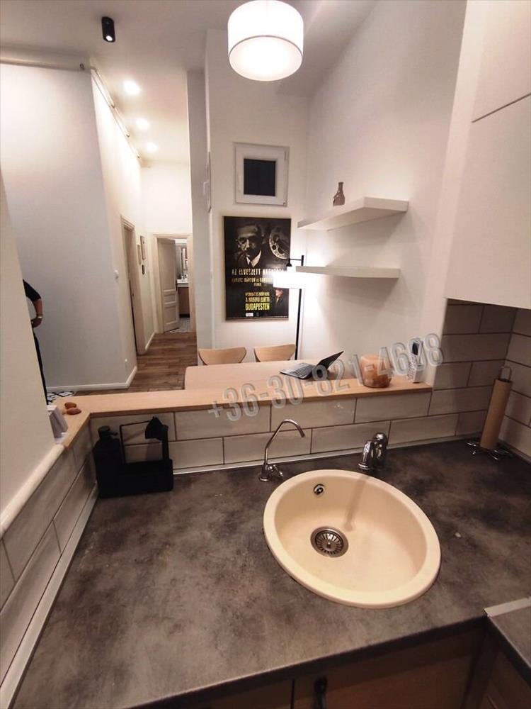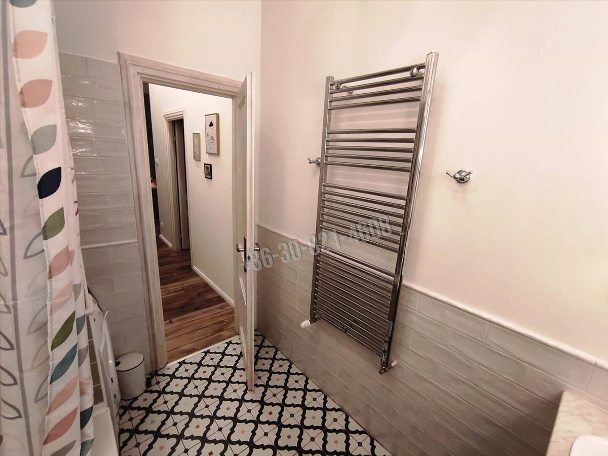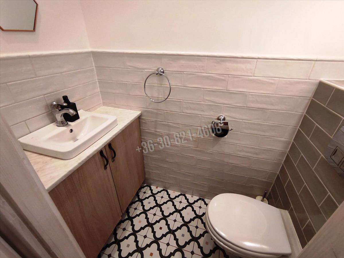 A fürdőszoba különleges burkolatokkal, káddal, beépített mosdóval rendelkezik, itt kapott helyet a mosógép és a kazán is. a wc külön helyiségben található, egységes dizájnnal. Extra plusz a kamra, ami ritka kincs a belvárosban.