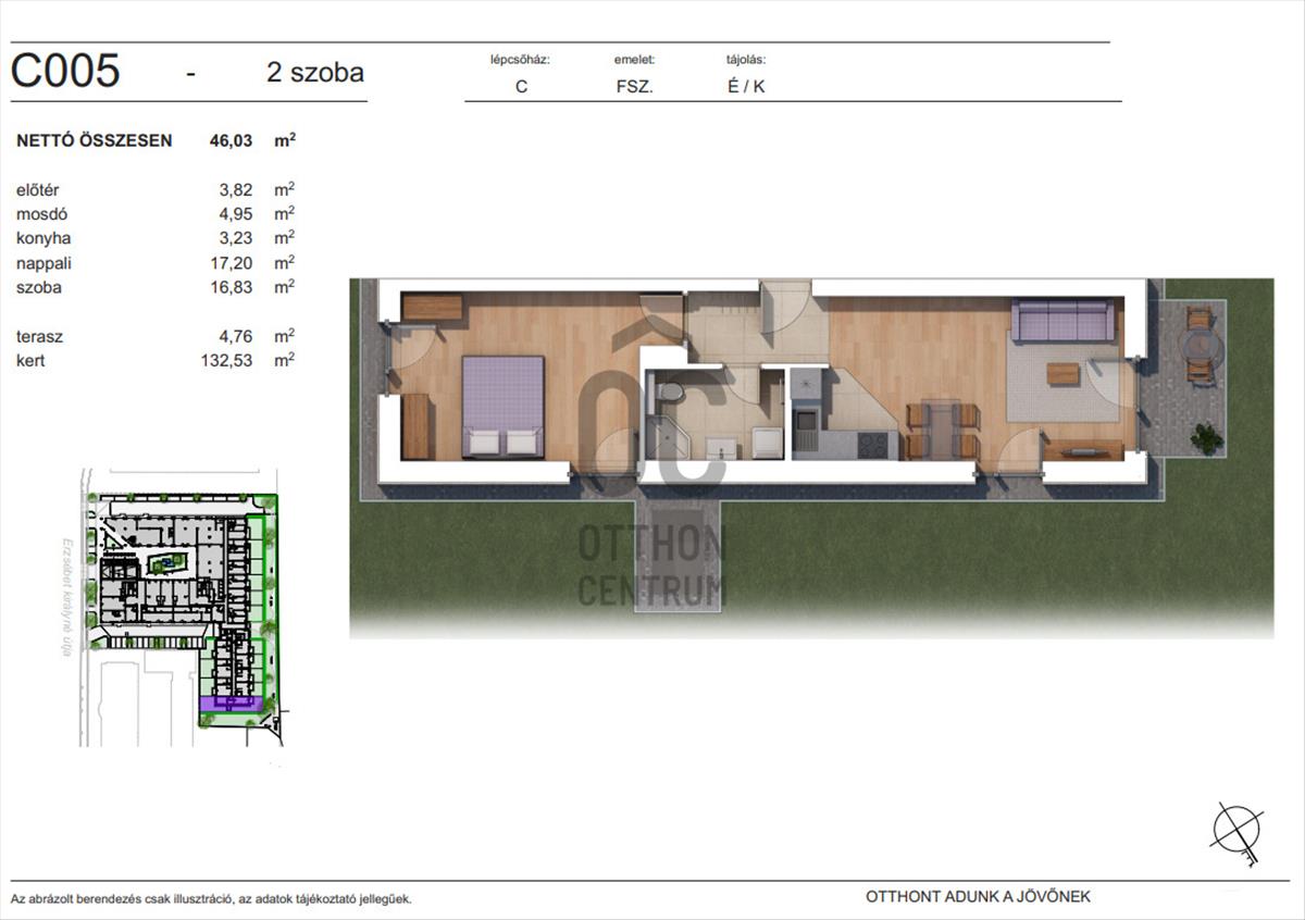 - Széles körű lakáskínálat: a modern kialakítású lakások nappali+1 szobás, illetve nappali+2 szobás elrendezésben érhetők el. Néhány földszinti lakás kertkapcsolattal is rendelkezik, automata öntözőberendezéssel.