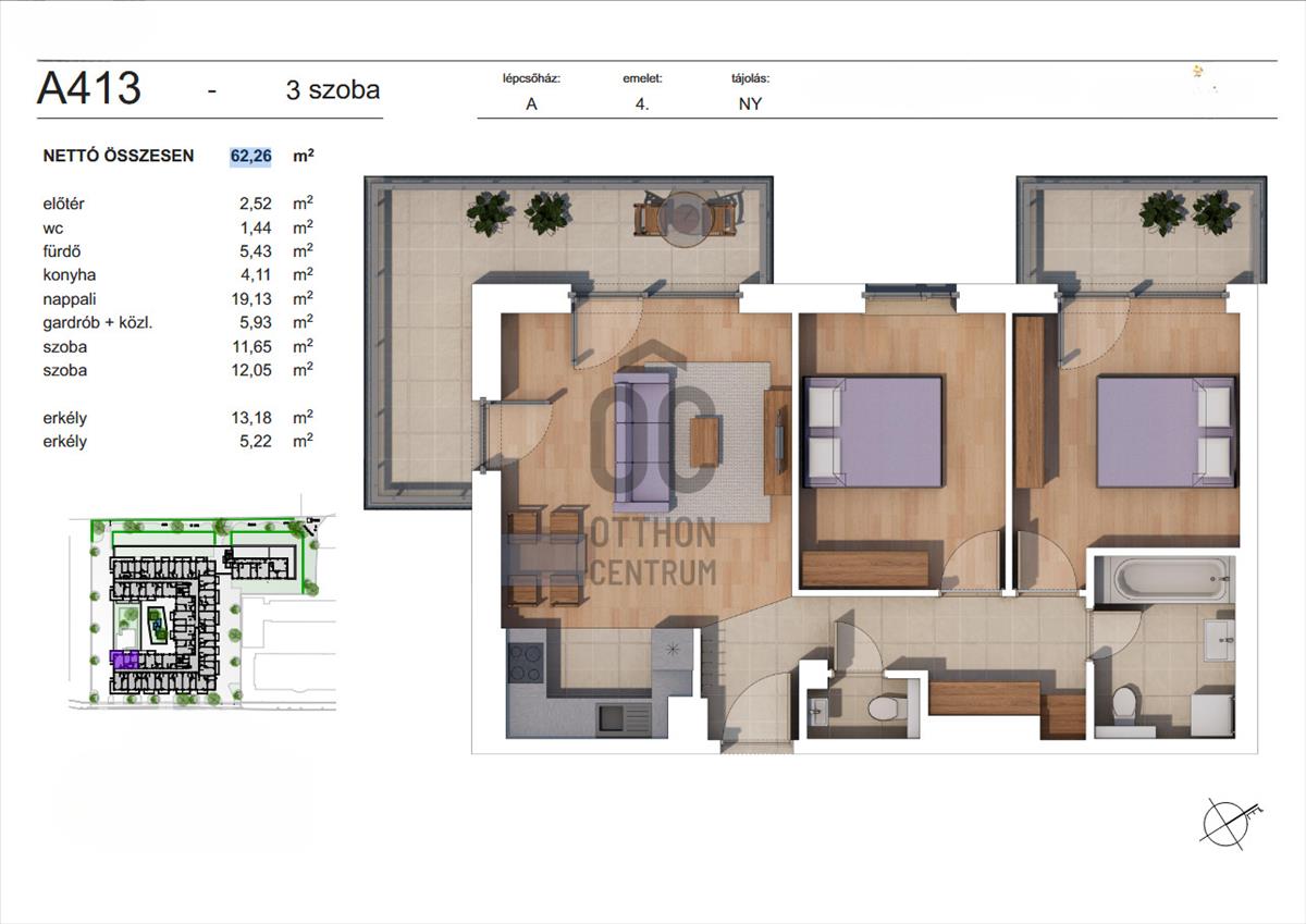 Nettó alapterület: 62,26 m2 + 5,22 m2 erkély + 13, 18 m2 erkél...