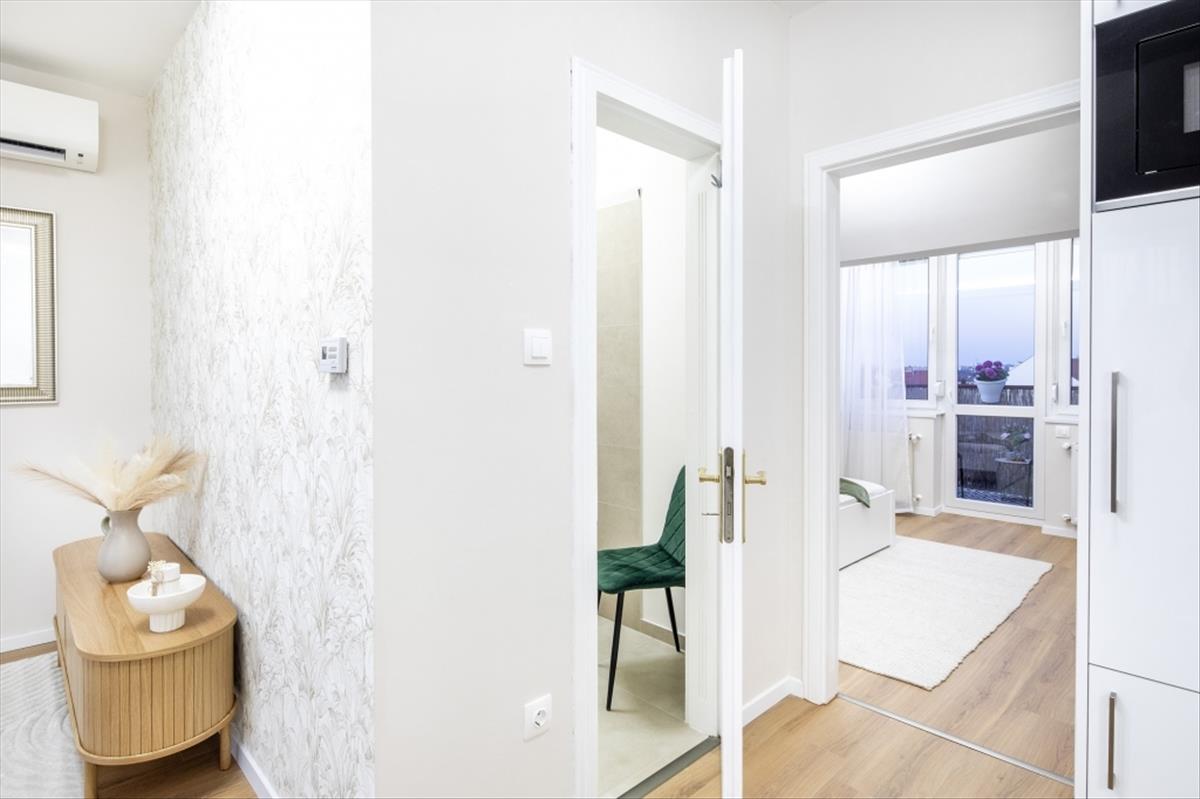 A lakásba belépve az előszobából nyílik egy mennyezetig tükrös ajtón keresztül a 3 nm -es gardrób helyiség, mennyezetig polcozva, led világítással ellátva, és itt aztán tényleg minden ruha, cipő elfér! Ha mégsem, akkor a pincében levő 2, 5 nm -es saját tároló ad további lehetőséget.