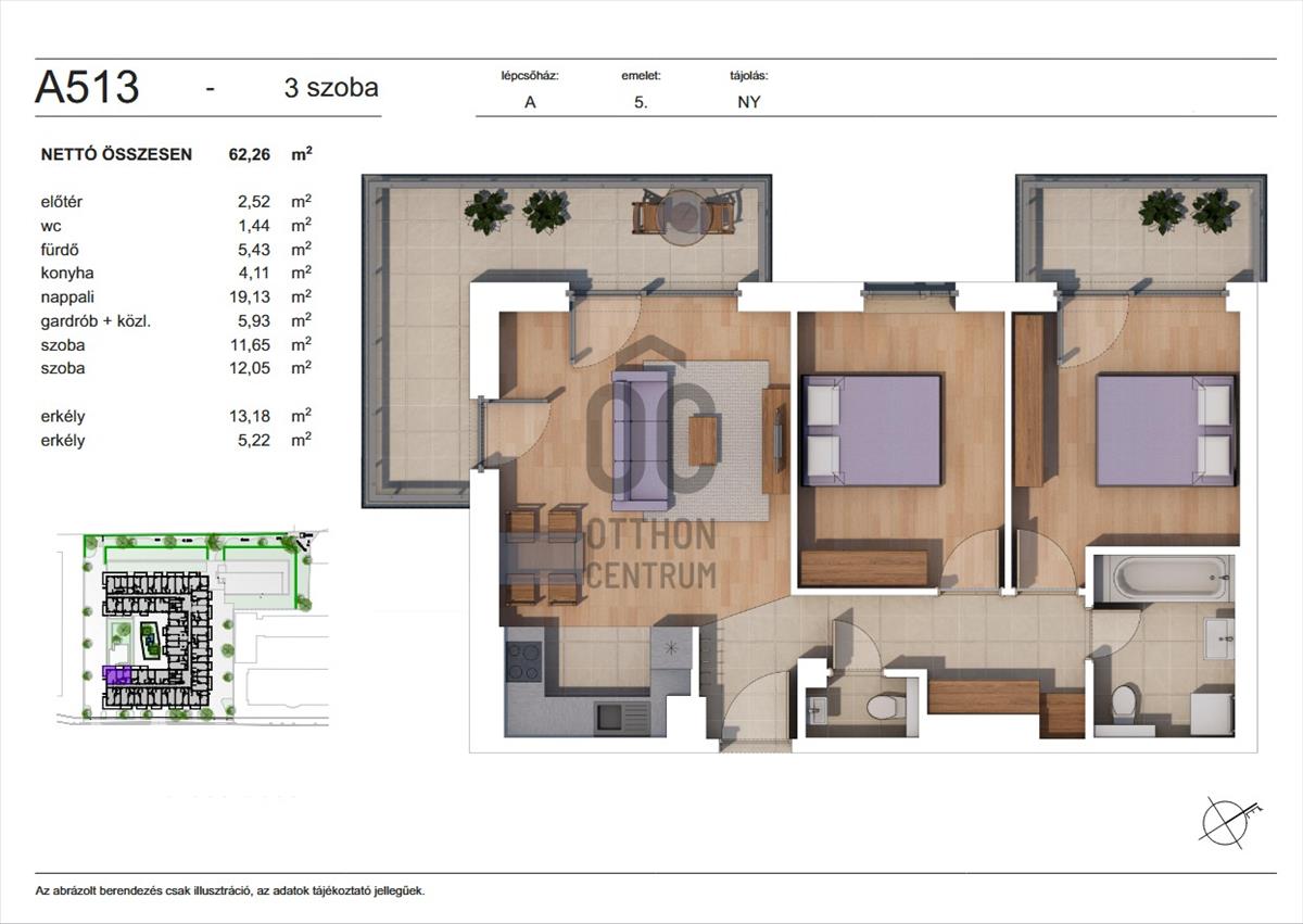 Az ingatlan nettó alapterülete 62,26 m² + 13,18 m² erkély +5,2...