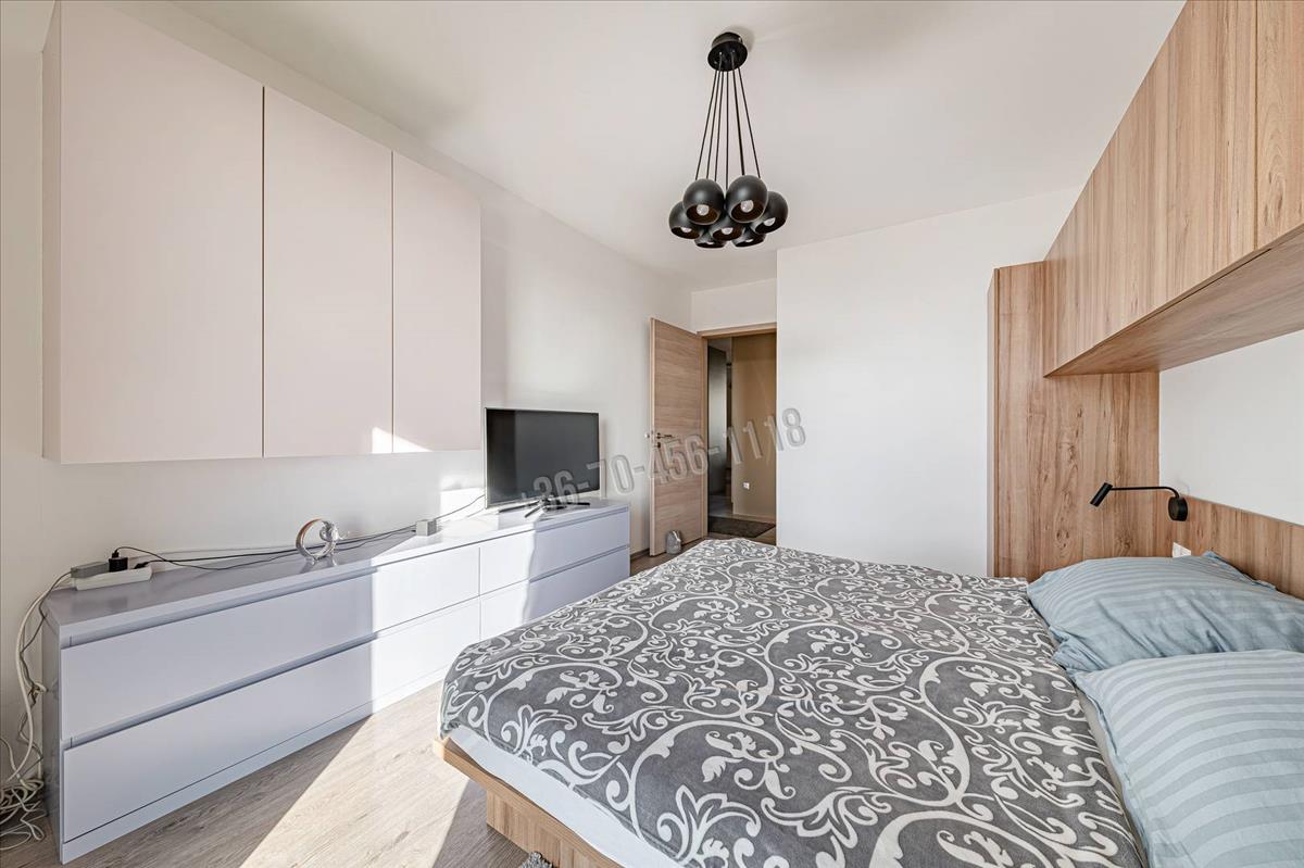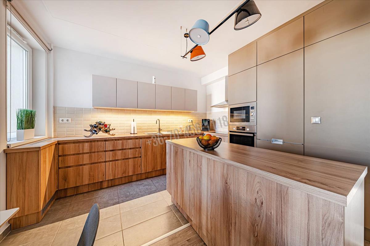 A belső tér kialakítása nemcsak esztétikailag egységes és letisztult, hanem kifejezetten funkcionális is. Az egyedileg, asztalos által gyártott beépített szekrények és rejtett tárolók végigkísérik az egész lakást, így a terek rendezettek, elegánsak és maximálisan kihasználhatók.
