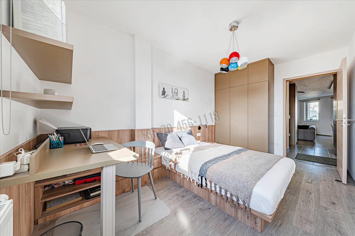 A két külön nyíló hálószoba intim, csendes tereket biztosít, mindkettő asztalos által készített francia ággyal és beépített gardrób szekrényekkel, amit a home OFFICE-ként is használható iroda sarok egészít ki.
