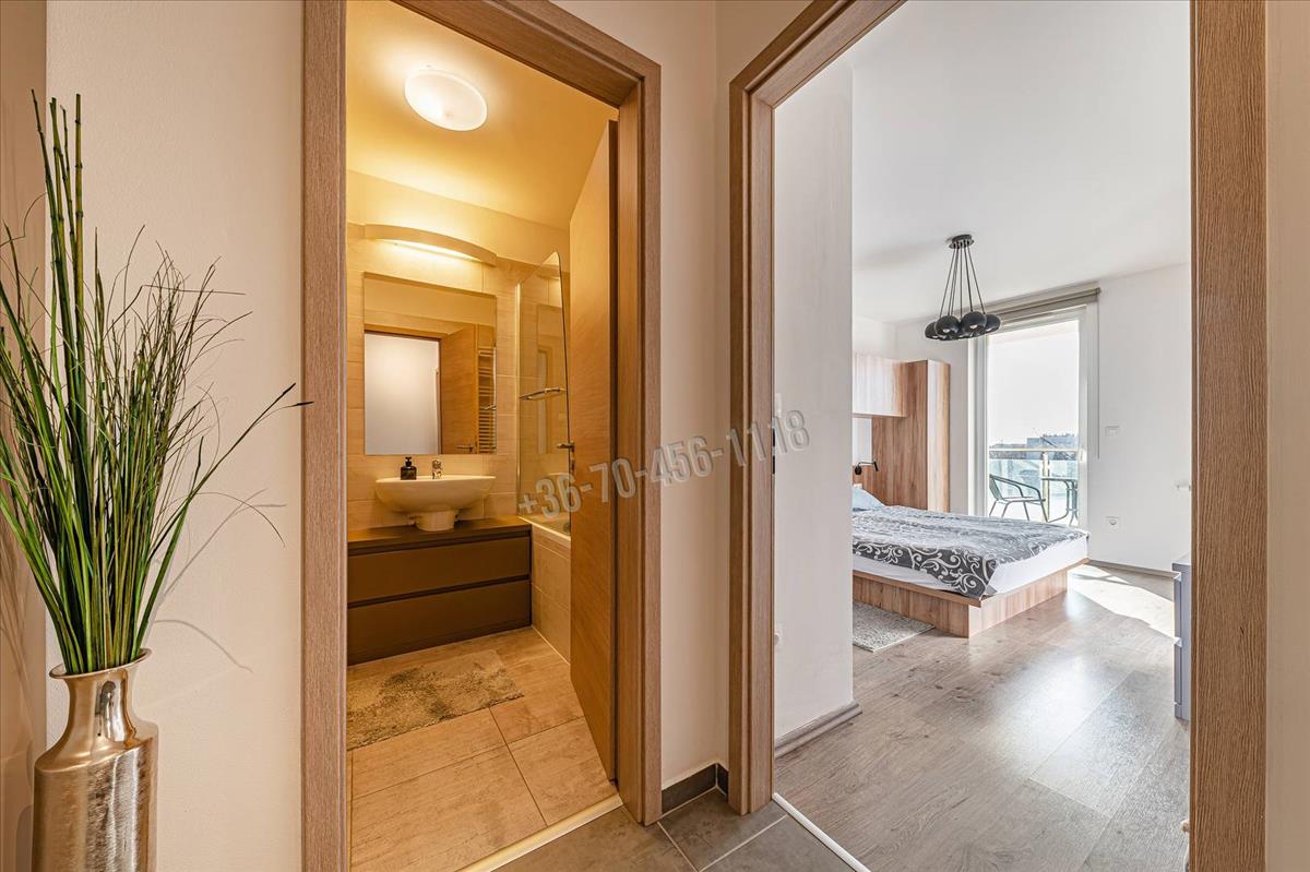 A penthouse szint alatti elhelyezkedés ritka előnyt jelent: megmarad a tetőszinti életérzés, mégis védettebb, intimebb környezetben.