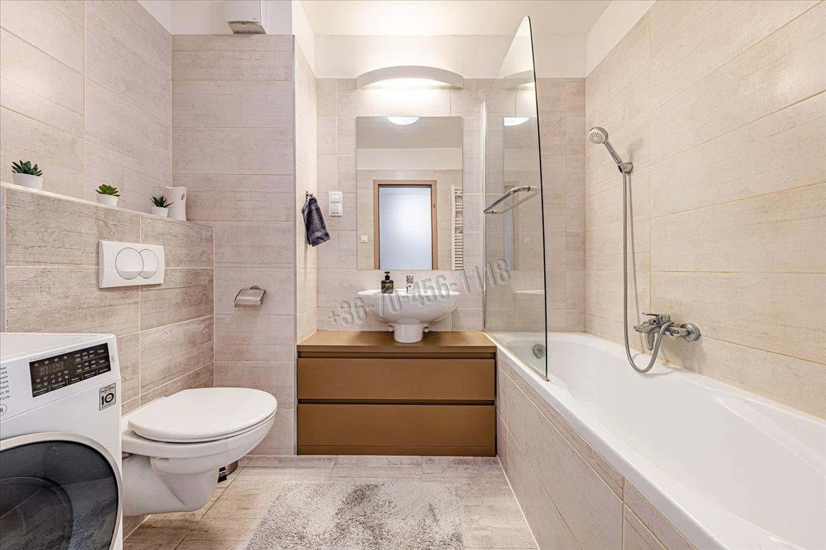 A fürdőszoba kádas kialakítású, zuhanyparavánnal, törölközőszárítós radiátorral és praktikus, fiókos szekrénnyel egybeépített mosdóval. Az előszobából külön vendégmosdó is elérhető, ami a mindennapi kényelmet tovább emeli.