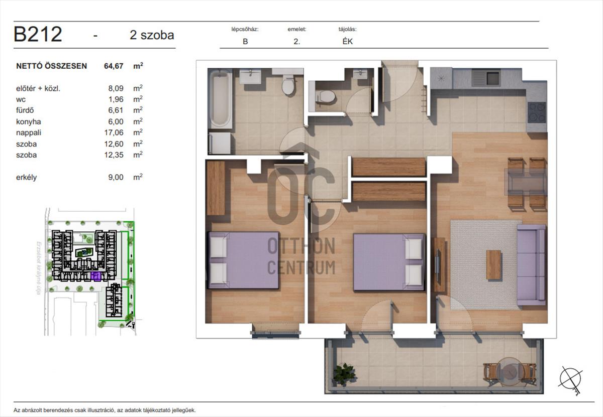 - Széles körű lakáskínálat: a modern kialakítású lakások nappali+1 szobás, illetve nappali+2 szobás elrendezésben érhetők el. Néhány földszinti lakás kertkapcsolattal is rendelkezik, automata öntözőberendezéssel.