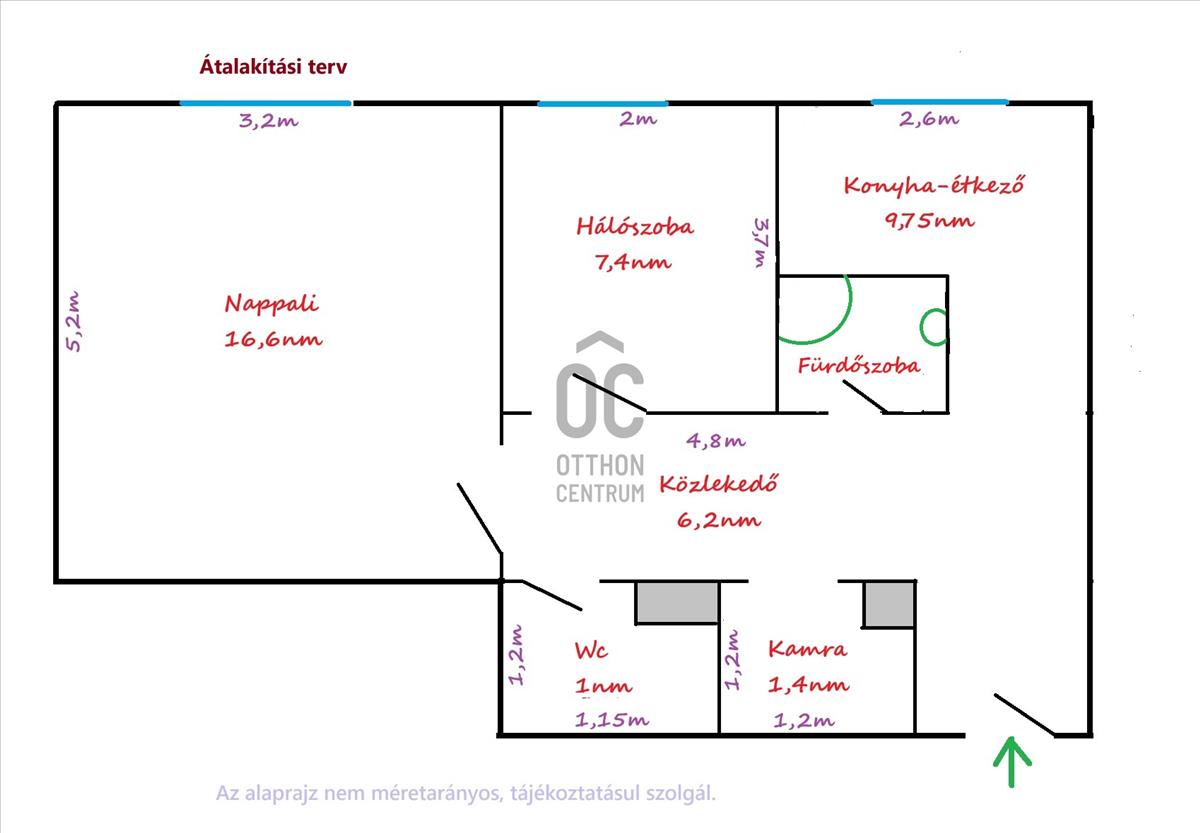 - a hirdetésben 2 alaprajz is elérhető: a jelenlegi állapot, valamint egy felújítás utáni elképzelés, fürdőszoba kialakításával (jelenleg a kád a konyhából megközelíthető, azonban a közlekedőből is nyitható lenne)