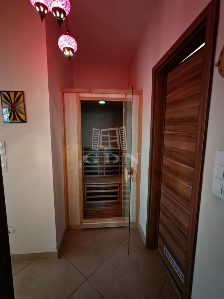 A magasfényű, modern konyhabútor és a beépített gépek az ár részét képezik, csakúgy, mint a lakásban található infraszauna.