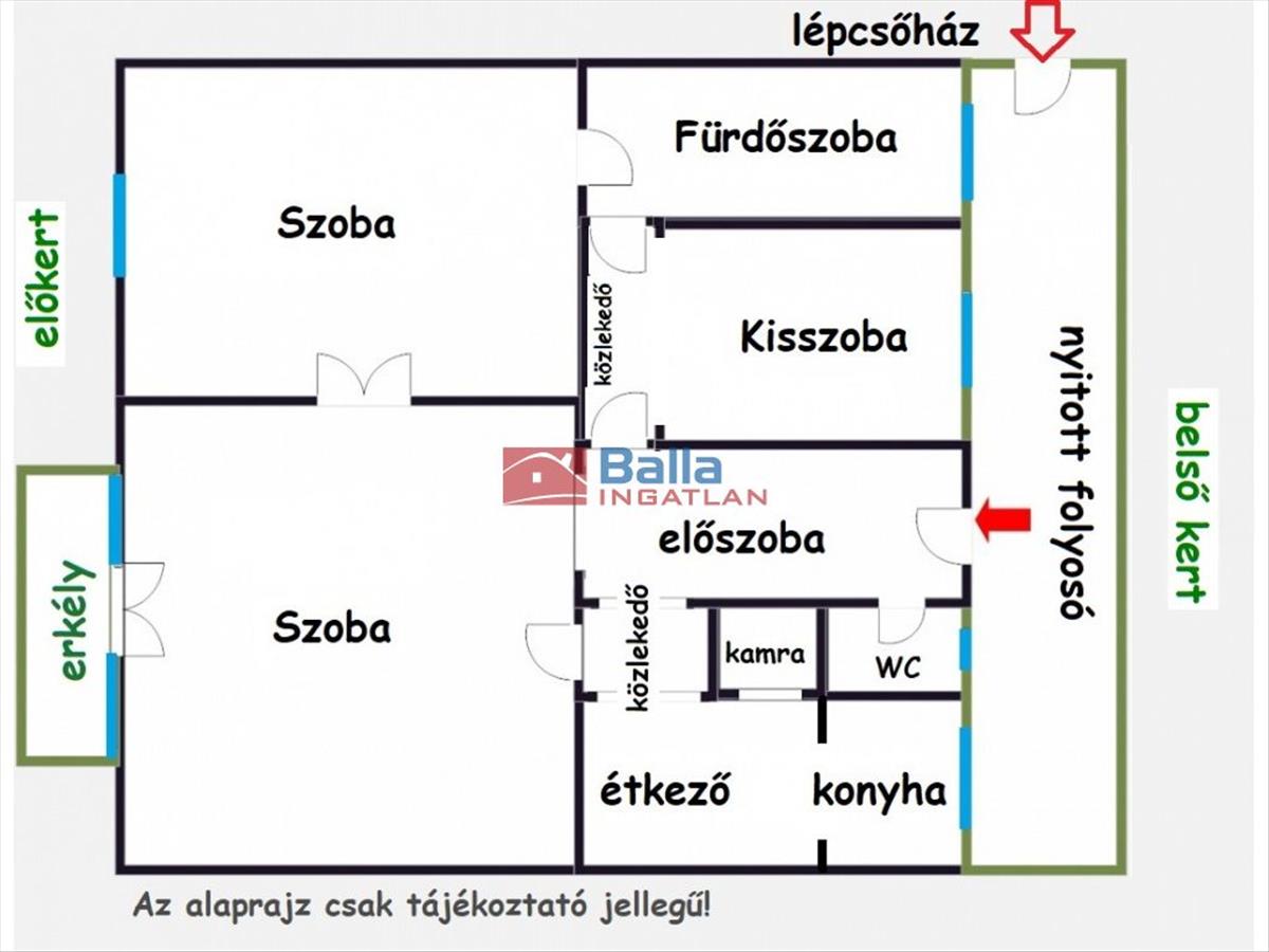 -Az erkély az előkertre, a nyitott folyosó pedig a hátsó kertre néz, innen még egy lakás nyílik;