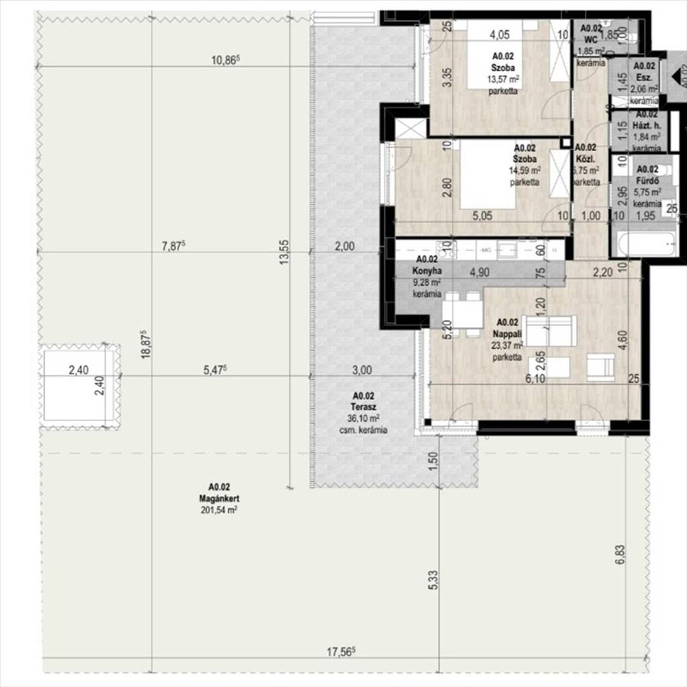Földszint: nettó 78nm lakás (3szoba) + 36nm terasz + 202nm saját kert