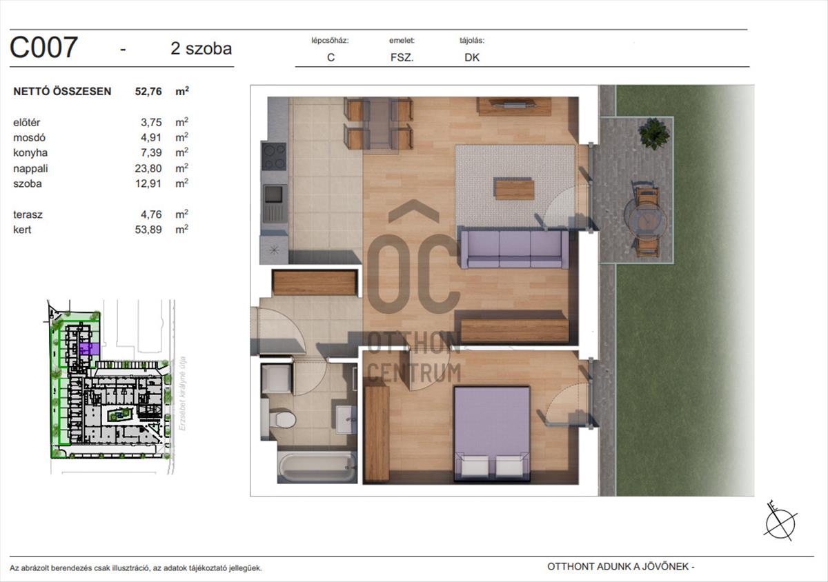 - Széles körű lakáskínálat: a modern kialakítású lakások nappali+1 szobás, illetve nappali+2 szobás elrendezésben érhetők el. Néhány földszinti lakás kertkapcsolattal is rendelkezik, automata öntözőberendezéssel.