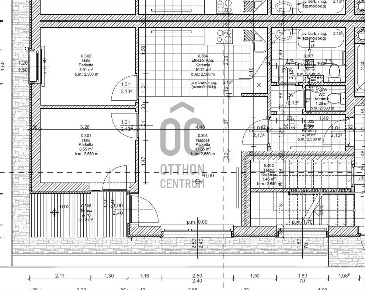 - helyiségei: nappali-étkező-konyha egy légtérben, két hálószoba, kádas fürdőszoba wc-vel,