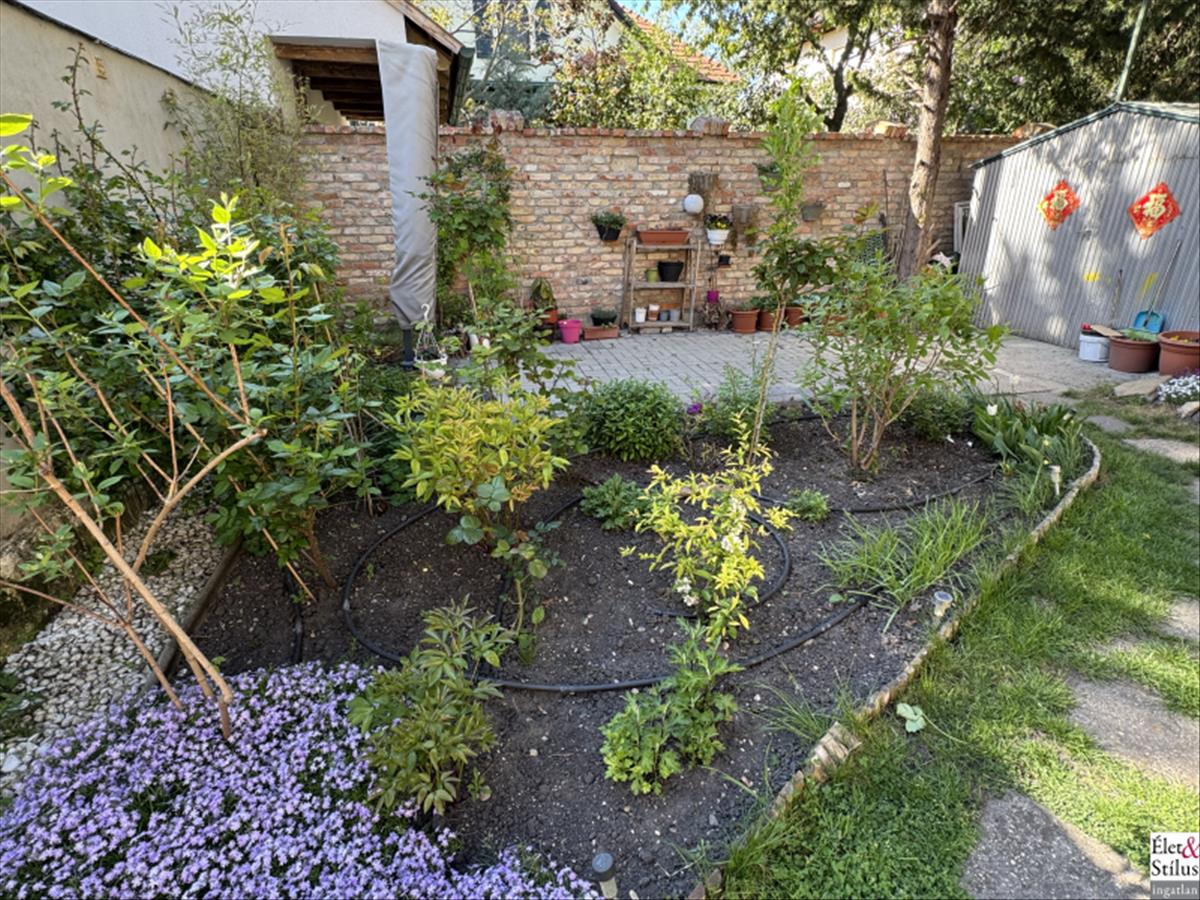 Kertrészünk, a béke szigete. Virágos, teraszos rész vár minket 85 nm -en, hogy élvezve a madarak csicsergését, a nyugalmat, kikapcsoldhassunk.