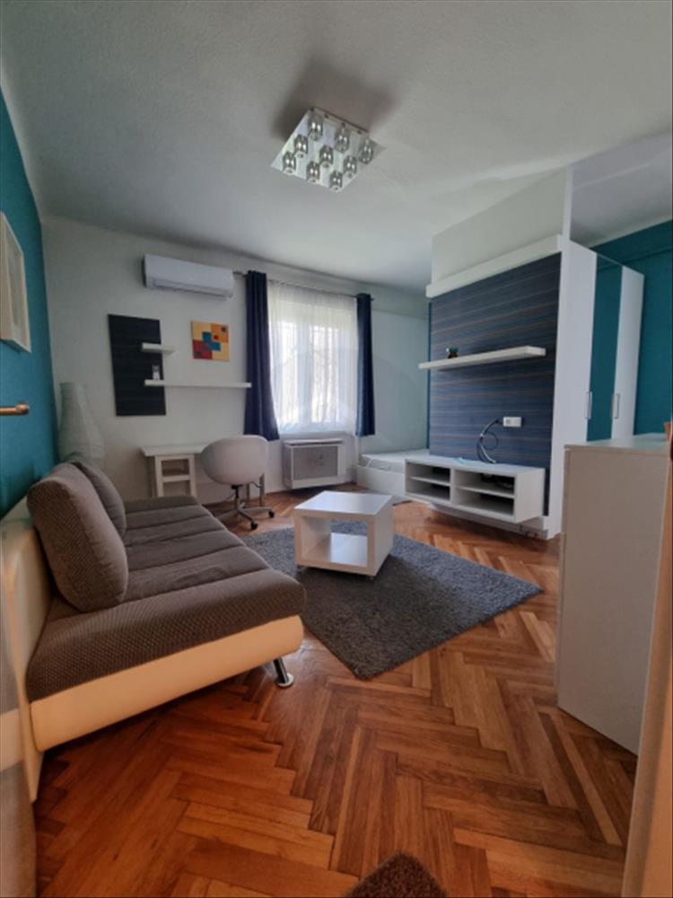 A szoba, konyha, fürdőszoba korszerű, műanyag ablakai a parkra néznek.