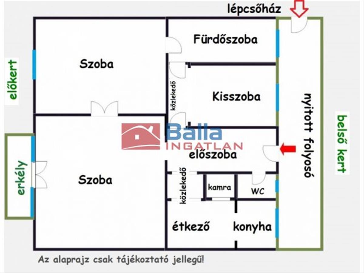-Az erkély az előkertre, a nyitott folyosó pedig a hátsó kertre néz, innen még egy lakás nyílik;