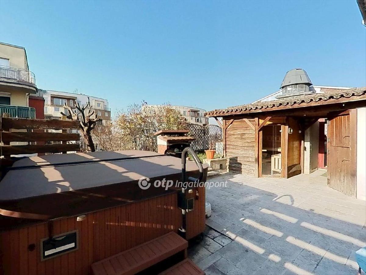 ***Penthouse lakás a hermina happy land LAKÓPARKBAN! ***Budapest XIV. kerületében, a Hermina Happy Land lakóparkban eladó egy v. emeleti, nappali+4 szobás penthouse lakás. a 180 négyzetméteres ingatlan 2 lakás egybebontásával kapta meg jelenlegi, egyedi kialakítását, belső építész tervei alapján, ügyelve a részletekre és a kényelemre. a 184 négyzetméteres teraszon klimatizált télikert került kialakításra, a jakuzzi és a szauna a vételár részét képezik. Az egész lakást körbe öleli a terasz, amely így a hálószobákból és a 70 négyzetméteres amerikai konyhás nappaliból is megközelíthető. Az ingatlan fűtése házközponti fűtés egyedi mérővel. a társasház mellett egy játszótér, park biztosítja a lakók és a gyermekek kikapcsolódását. a lakáshoz tartozik gépkocsibeálló, amelyeket a vételár nem tartalmaz. a gépkocsibeálló irányára 6, 5 millió Ft.