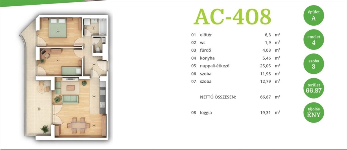 Ez a lakás nappali+2 hálós, 67nm alapterületű és tartozik hozzá egy 19nm-es terasz is.
