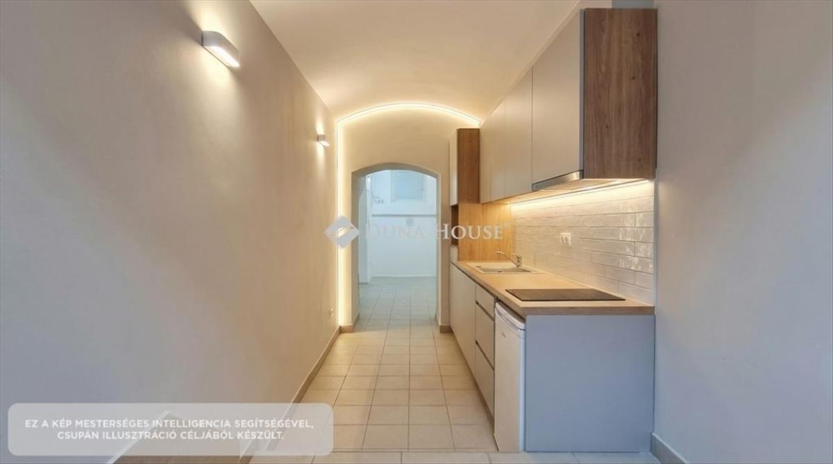 - Előtér + konyha beépített bútorral, főzőlappal, sütővel és hűtővel