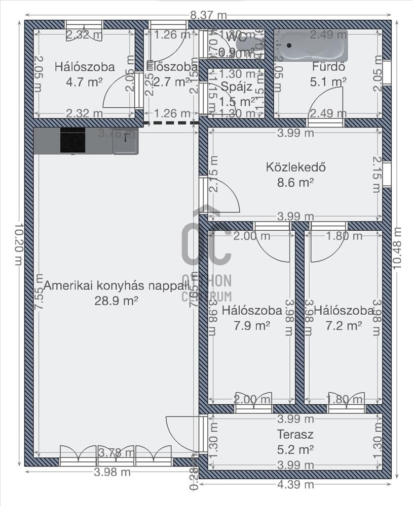 Az ingatlan 3+ fél szobával került kialakításra. Hatalmas amerikai konyhás nappali a középpont, ideális a családi együttlétekhez és baráti összejövetelekhez.