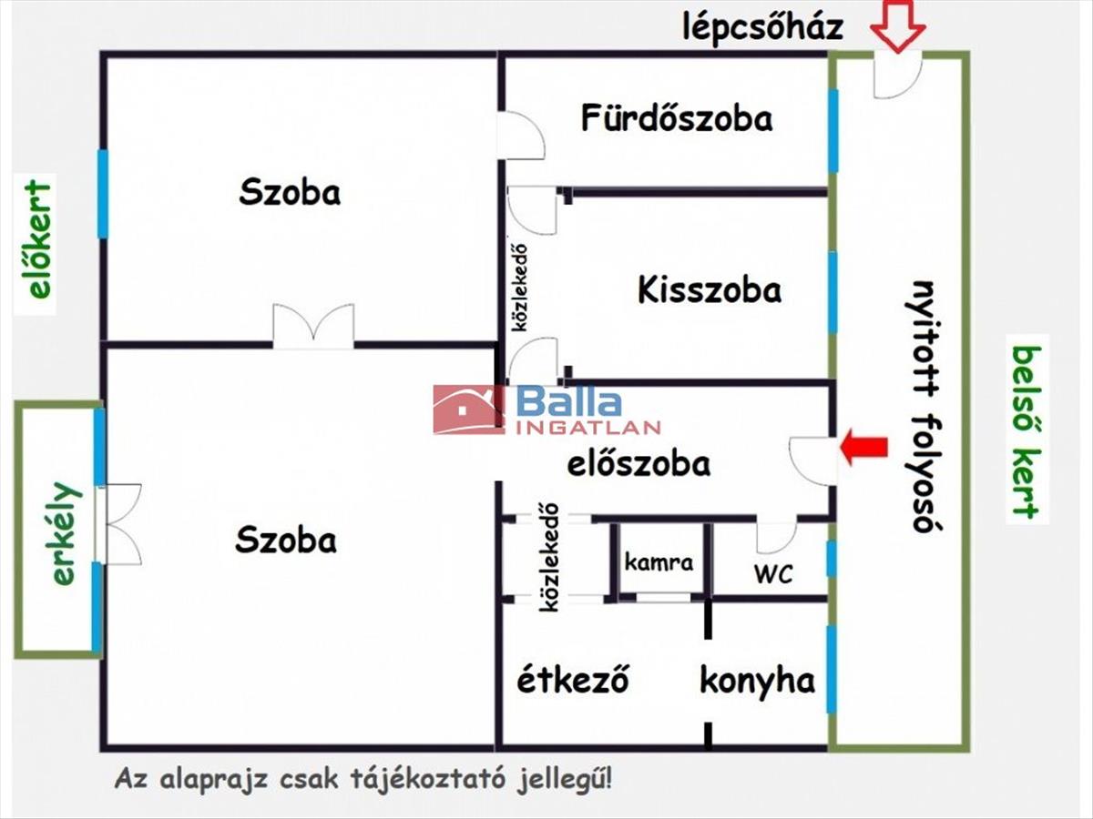 -Az erkély az előkertre, a nyitott folyosó pedig a hátsó kertre néz, innen még egy lakás nyílik;
