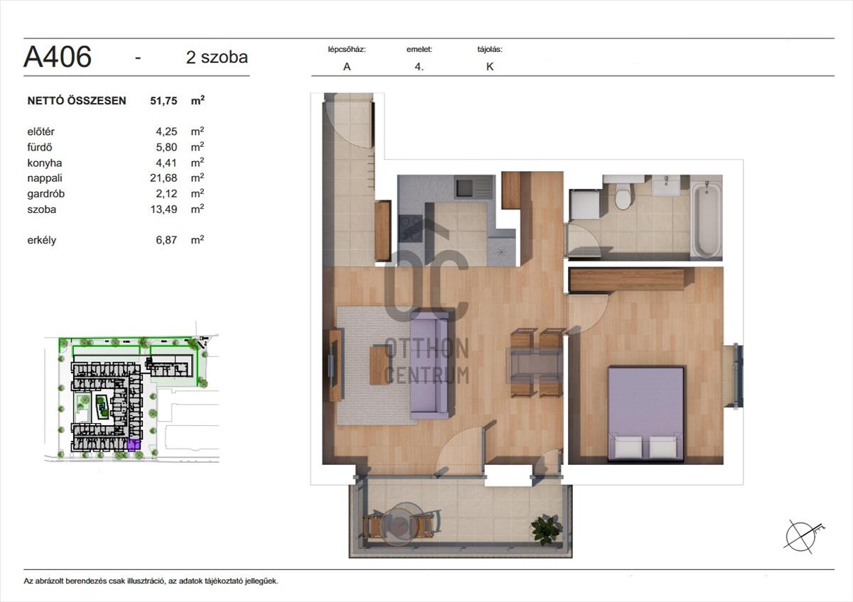 - Széles körű lakáskínálat: a modern kialakítású lakások nappali+1 szobás, illetve nappali+2 szobás elrendezésben érhetők el. Néhány földszinti lakás kertkapcsolattal is rendelkezik, automata öntözőberendezéssel.
